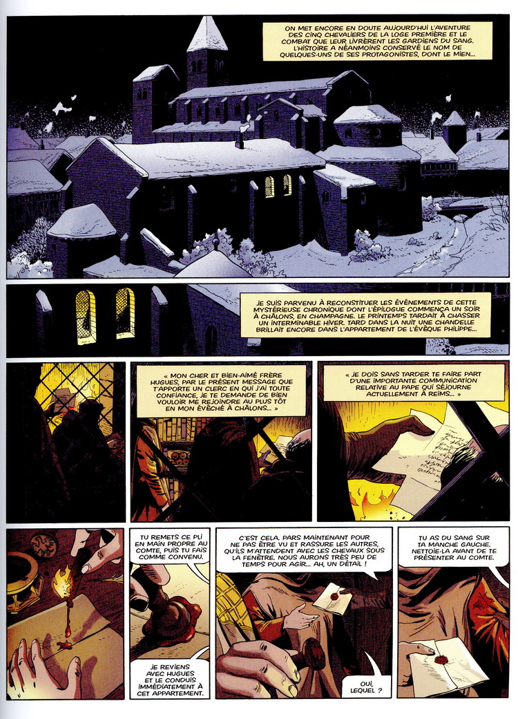 Ils étaient cinq à avoir fait le serment de la Loge Première, il ne reste désormais plus qu'Hughes de Payns et le Comte de Champagne face à la folie meurtrière des Gardiens du Sang qui sont, plus que jamais, résignés à maintenir intacte la vérité des saintes écritures.