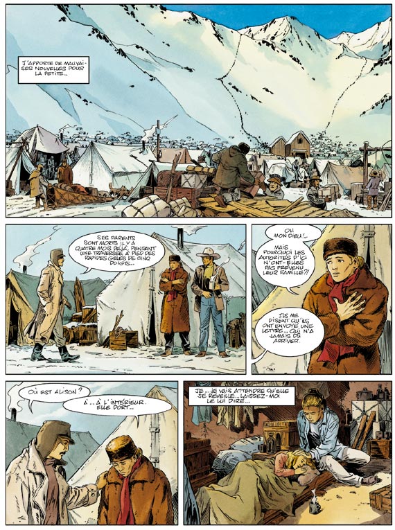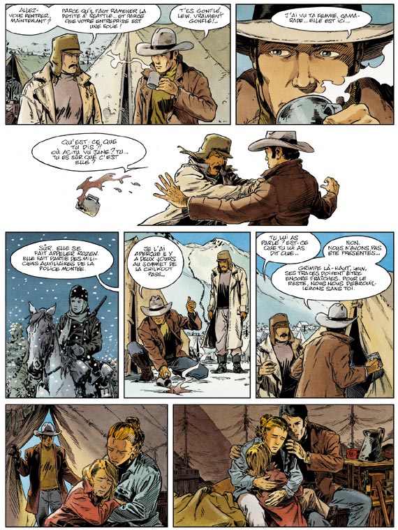 Bien sur, le dessin est joli, les lieux sont réalistes dans la chronologie, mais je me suis perdu dans ces Eldoradores...Peut être parce que le manque des deux premiers volumes m'a empêché de saisir la substance même de cette saga!Le fait est que je n'y ai vu qu'une énième série de Western, regorgeant de personnages qui se croisent, semblent avoir des liens intrinsèques, mais dont la finalité m'échappe, le tout, mâtiné d'une fâcheuse tendance à la Dead End(l'inverse d'Happy End) qui, si elle réussissait au film Légendes d'automne(j'ai trouvé une certaine ressemblance entre ces deux créations, pourtant aux antipodes l'une de l'autre, allez savoir pourquoi...), a eu tendance à me barber, du fait d'un misérabilisme latent et pas vraiment avoué...