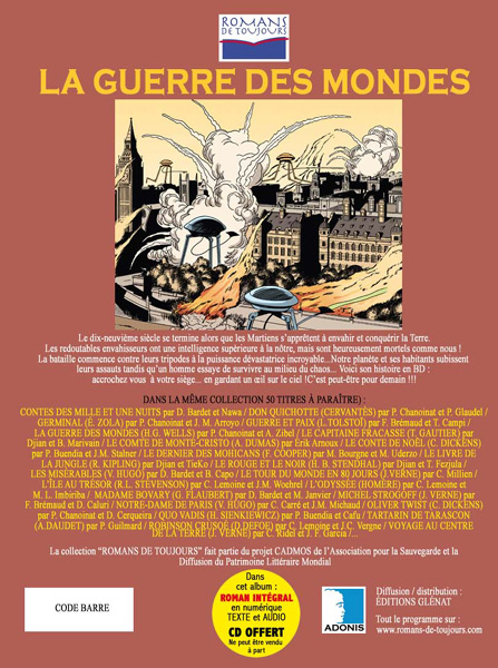 Série : La guerre des mondesAuteur : HG Wells & P. Chanoinat & A. Zibel Prix : 13€ Date de sortie : 06/12/2007 Nombre de pages : 64 pages couleurs Catégorie : Fantastique Type de reliure : Album cartonné Éditeur : Adonis Collection : Roman de toujours Lien spécifique : http://www.romans-de-toujours.... Publié le 25/01/2008 |