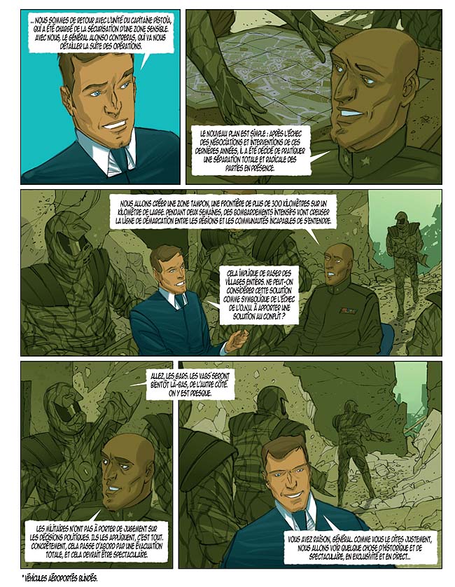 Le scénario de Matz (qu'on ne peut s'empêcher de rapprocher de celui de sa série Le tueur pour la façon dont le héros, Douglas, se parle à lui même), a des résonances avec l'actualité, et particulièrement avec le boom de la Télé-Réalité (émissions télévisées où est filmée la vie quotidienne de personnes sélectionnées pour y participer (exemples: Loft Story ou Star Academy...)). On peut aussi le rapprocher du Show-Biz (industrie, métier du spectacle). Le thème de la privatisation de la guerre n'est pas nouveau sinon qu'ici les missions privées sont mandatées par l’ONU. On y trouve enfin un écho vraisemblable consistant à faire le lien entre les événements de l'intrigue et la solution actuelle aux conflits internationaux. La médiatisation vue par Matz est à peine plus grande que dans la réalité: goût du sang, sensations fortes, audimat, record d’audience sont là pour faire de l'argent comme dans notre réalité ! La série a débuté avec Jacamon au crayon. Pour ce troisième opus, De Meyere succède à Jacamon et peine à se montrer à la hauteur. Aux planches superbes de Jacamon qui traduisaient parfaitement la sensualité des scènes d'amour et l'horreur des scènes de combats, De Meyere enchaîne avec un dessin un peu fade, comme d'ailleurs le sont les couleurs, et ne parvient pas à faire oublier le graphisme des deux épisodes précédents. Non dénué de talent, il va pourtant devoir confirmer tout le bien qu'on pense de lui...