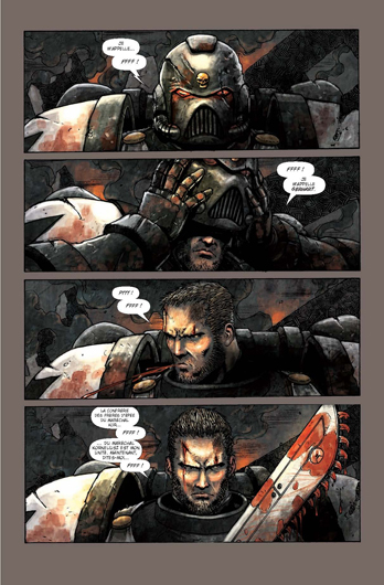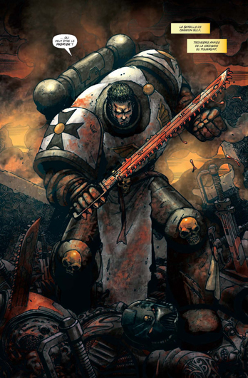 Je ne vais pas dire que Warhammer est un flop mais je me suis ennuyé à la lire. Il y a beau avoir du sang, des combats, des barbares, des machines… on s’endort totalement. Ce qui m’a endormi ce ne sont pas les dessins qui eux sont excellents mais plutôt les textes qui sont vraiment pompant. Il n’y a déjà pas une page où « Mon frère » n’est pas inscrit. Je ne sais pas s’il faut parler comme cela lors d’une partie de Warhammer, parce que si c’est le cas ce jeu n’est pas pour moi. Pourquoi ces guerriers parlent t’ils autant même pendant qu’ils combattent, ça fait un peu rigoler.