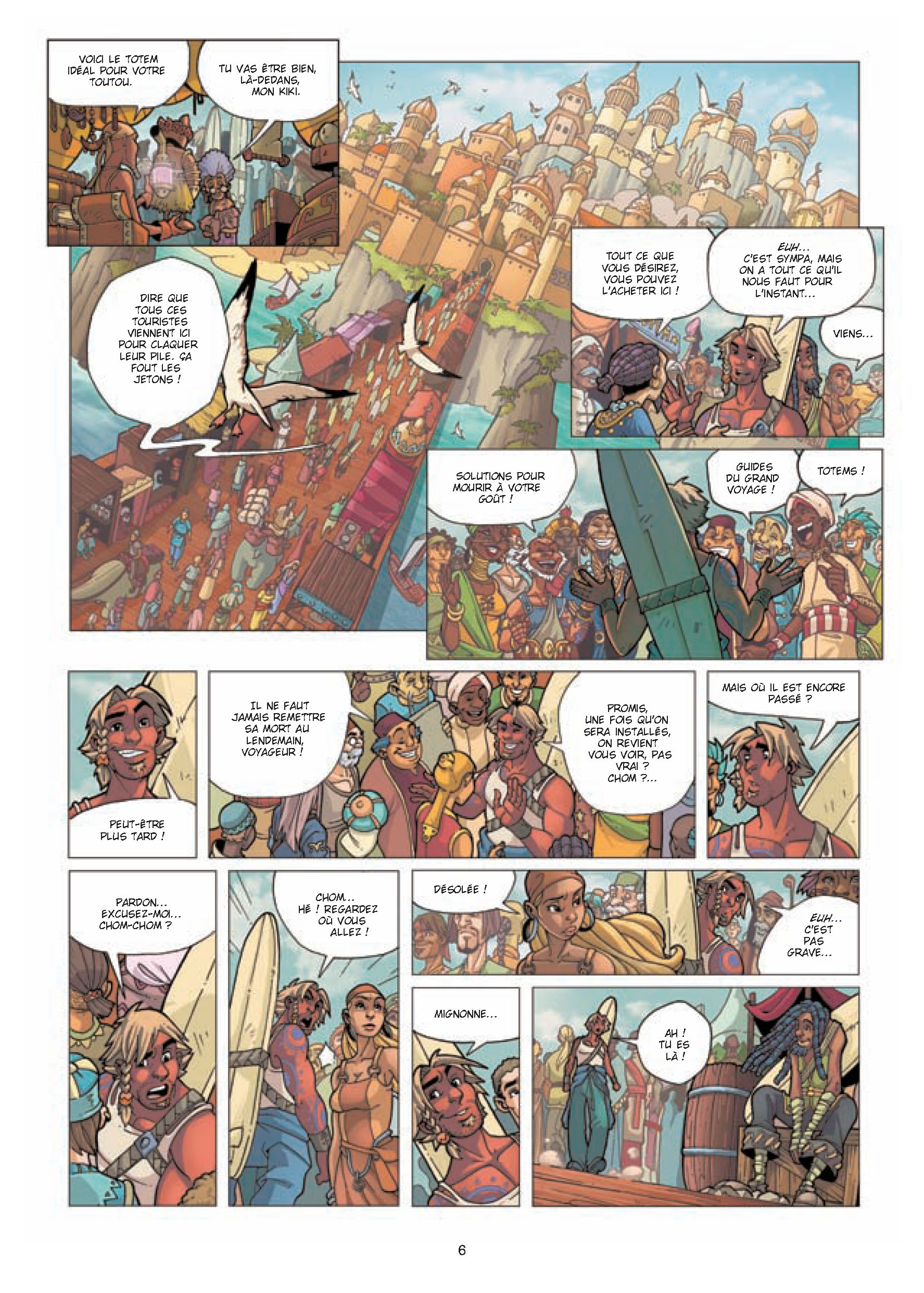 Quand au scénario malgré quelques petits passages rapides, tient très bien la route et arrive à nous plonger dans un univers hors du commun sortant des sentiers battus de ce qu’on peut lire habituellement. Comme avec le dessin, l’histoire suit les codes d’un bon scénario d’aventure avec tout ce qu’il faut pour nous faire passer un bon moment. L’idée des réincarnations est vraiment bien trouvée même si des fois on s’embrouille un peu dans toutes ces vies. Les Totems sont une bonne trouvaille, le fait de les faire ressembler à des robots au style un peu steampunk marchant à la vapeur, ne dérange en aucun point dans cet univers très coloré et fun.