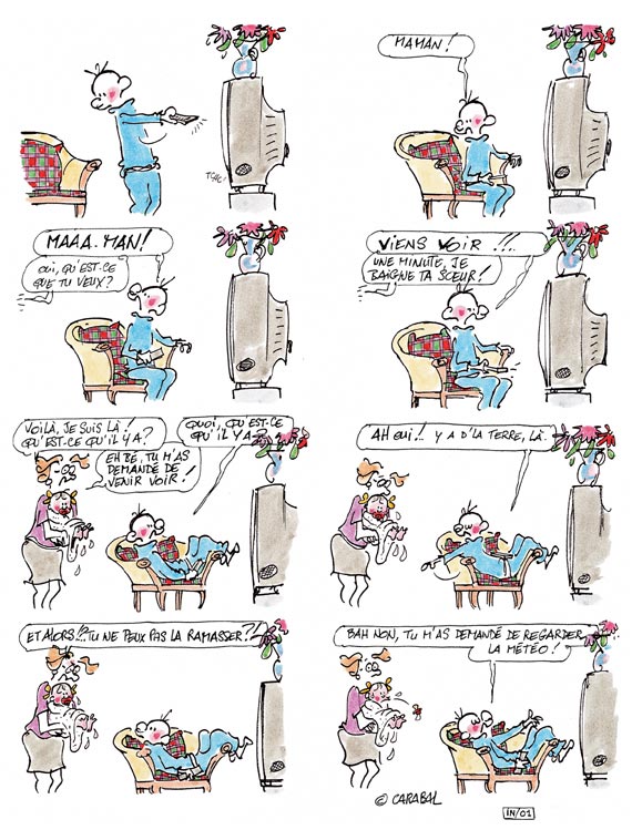 le style de cette bd sans contour de case n'enleve rien au charme et à l'humour qui font aussi les beaux jours de l'hebdomadaire Femme Actuelle. De bonnes tranches de vie dessinées avec malice par Carabal pour ce numero 12 de la série.