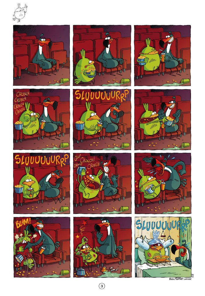 J'ai litteralement adoré cet album de la premiere à la derniere page. Lapuss et Tartuff égrainent les gags avec talents tout au long de ce tome 1 des aventures burlesques d'un oiseau bêta. Il est parfois même touchant ce volatile qui met à rude épreuve vos zygomatiques. Les dessins de Baba sont à se faire eclater la rate tellement ils sont irresistibles. Cela faisait un petit bout de temps que je n'avais pas ris de bon coeur à ce point. Je vous conseille vivement de vous procurer cet album afin de passer un agréable moment de franche rigolade cet été.