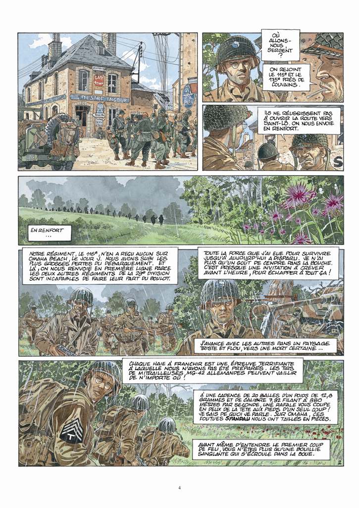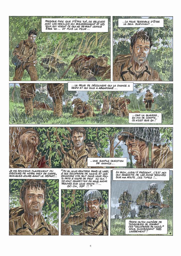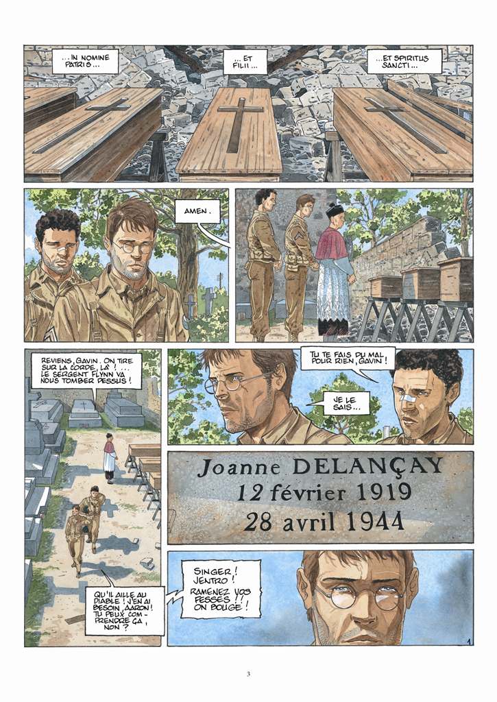 A la fin de la lecture du troisième volume, j’étais déçu de la politique de l’éditeur qui avec la publication de la couverture du quatrième volume dévoilait un élément décisif du récit démontant en partie l'intrigue construite par le dessinateur (la dernière case du troisième tome nous présentait les funérailles de Joanne et la couverture du quatrième tome nous montrait la jeune fille avec en arrière plan Notre Dame de Paris). Aujourd'hui, je suis admiratif du travail effectué par Philippe Jarbinet qui nous plonge avec ce quatrième tome dans le quotidien des G.I’s débarqués sur les plages de Normandie et progressant dans les bocages Normands aux prix de nombreuses pertes. Les représentations des diverses difficultés rencontrées par les soldats entraînent les lecteurs vers des scènes fortes en émotions et plus sanglantes par rapport aux volumes précédents. L’auteur qui est aussi le scénariste a fait un travail remarquable de souvenir vis-à-vis de ces jeunes américains tombés loin de chez eux sur le sol européen dans le but de nous libérer du nazisme. Son scénario est une grande leçon de tolérance, de pardon et débouche sur un grand manifeste sur l’absurdité de toutes guerres et sur les horreurs entraînées par chacune d’entre elle. Un livre à mettre entre toutes les mains, surtout adolescentes, afin que l'on oublie jamais les sacrifices effectués par nos grands parents pour construire la plus longue période de paix jamais connue en Europe. J'ai aussi énormément apprécié les dernières pages de l'album dont notamment la dernière case représentant le WTC en transparence (nous sommes le 22 11 1963) au pied de la statue de la liberté alors que l'avion du président Kennedy vient d'atterrir à Dallas... et que la construction des tours n'a débuté quelques années plus tard. Maître achat à se procurer d’urgence … et un dessinateur scénariste qui pour moi entre dans la cour des grands avec la réalisation de cette aventure Airbone 44. NB : Lire la préface signée par l’auteur avant de débuter la lecture de ce dernier volume.