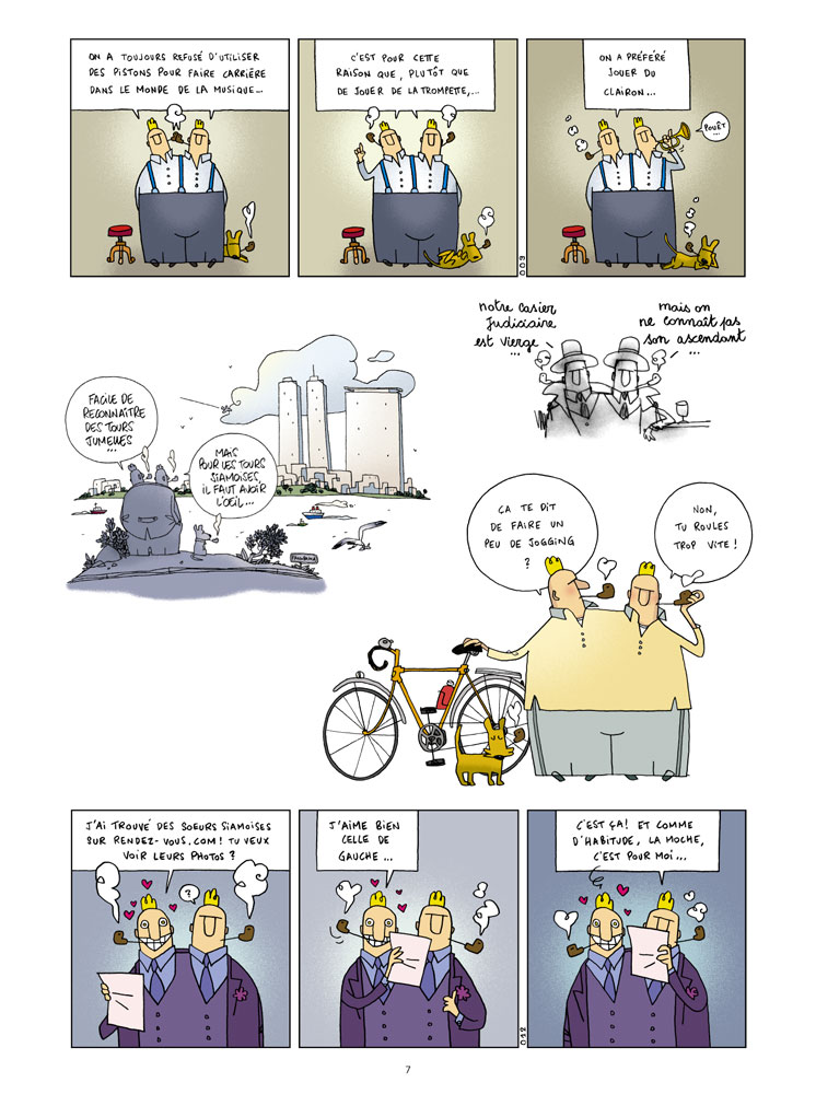 Les siamois ne sont pas seulement doubles, ils sont aussi et surtout uniques. Ils sont comme deux facettes qui composent notre personnalité, disant tout haut ce qu’on se dit à soi-même, le plus souvent tout bas. En bref, ils reflètent le dialogue entre notre conscient et notre inconscient. Si en tout homme, il y a un siamois qui sommeille, Serge et Bernard sont chargés de le réveiller. Debout, grosse feignasse !