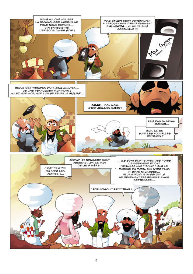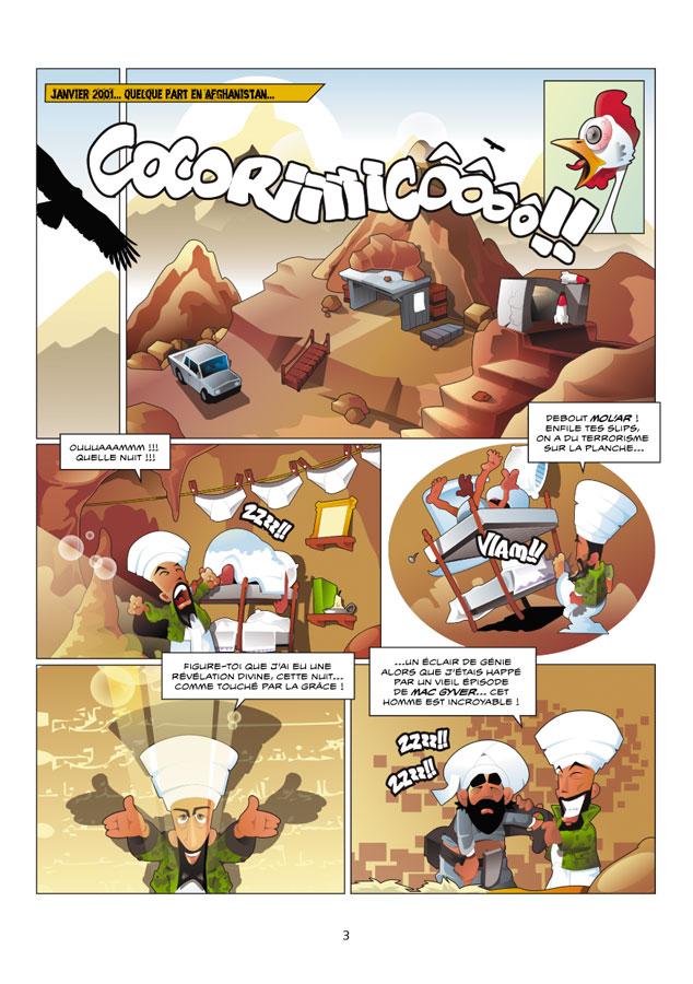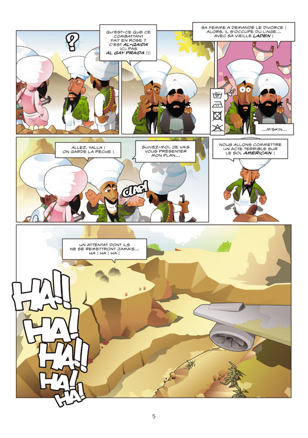 Ici on vous dit toutes la vérité ! Le vrai prétexte de l'invasion de l'Irak par les états-unis ! Vous l'aurez compris, les bush, Laden et consort sont bien dépeint par Azim. Vous zygomatique seront bien tendu et détendu à a vision d'un Sadam Hussein déguisé en Père Noël qui distribue des cadeaux piégé aux soldat américains, d'un de Villepin racontant des histoires de schtroumpfs ou encore des successions de Columbo et Sarkozy en pagaille.