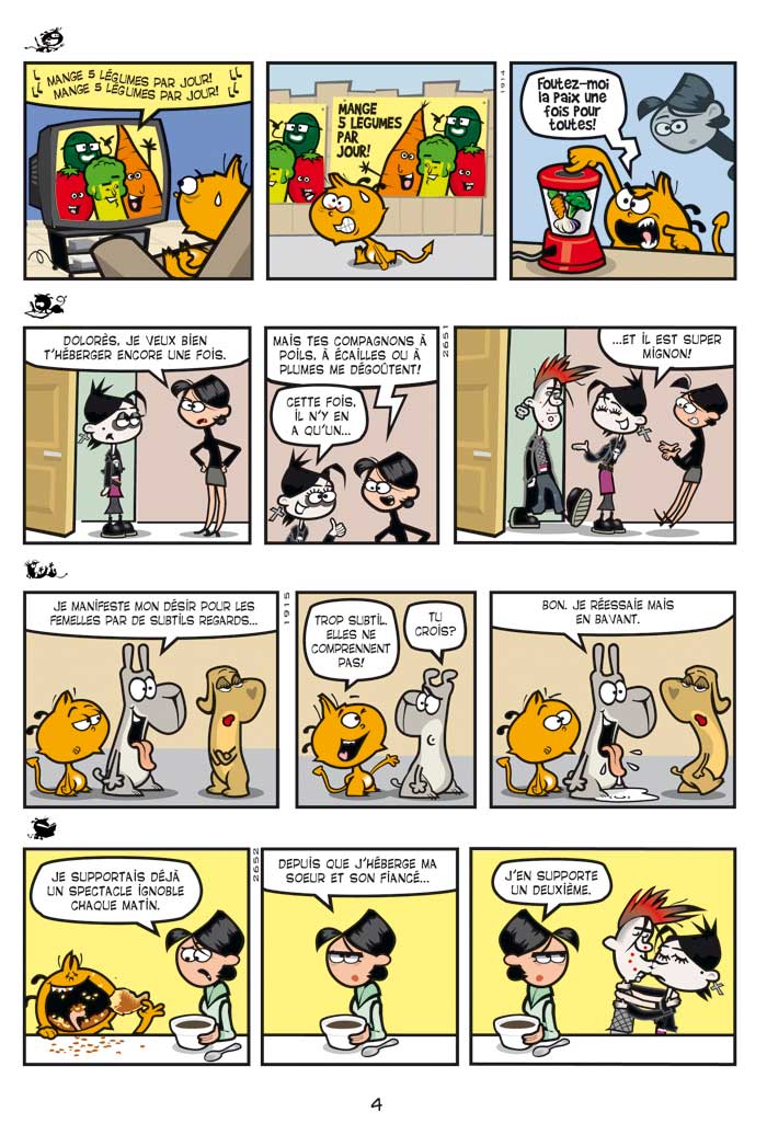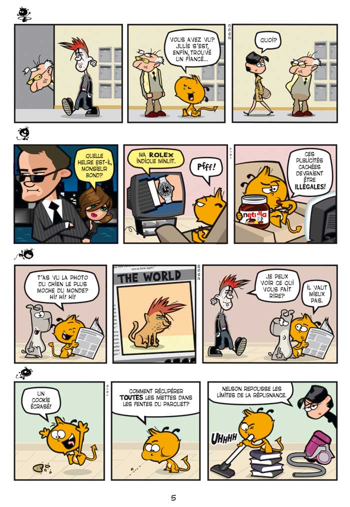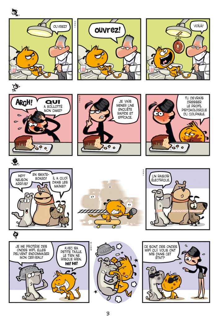 Comment se lasser de ce petit diablotin orange ? Inutile de résister c'est irrésistible. Même les plus imperméable à ce genre d'humour auront l'humilité de reconnaître que cet humour bon enfant peut en dérider plus d'un. Et ce n'est pas ce nouvel album qui va déroger à la règle établie depuis le début par le facétieux Nelson : Manger tout ce qui est bon même si ce n'est pas bon pour la santé, en faire voir de toutes les couleurs à Julie surtout à son travail, se bagarrer avec Floyd, mettre la zone partout ou il le peut et surtout si la venue de la sœur de Julie est un prétexte tout à fait opportun pour délivrer tous sont art de la facétie. C'est que cette fois-ci la petite sœur attaque au lourd, au brutal avec un petit ami aux allures de rat de laboratoire qu'on a peint en noir et gris et qui a autant d’énergie qu'une coquille saint jacques d'after réveillon. Et pour couronner le tout un rebondissement à la fin de ce nouveau tome, promettra dans les prochains de nouveaux gags désopilants mais...je ne vous en dis pas plus. Alors si la dépression vous guète, je vous conseille de prendre cette petite pilule orange matin, midi, soir ou peu importe le moment de la journée. C'est garantit sans effets secondaire et en plus c'est adorablement contagieux.
