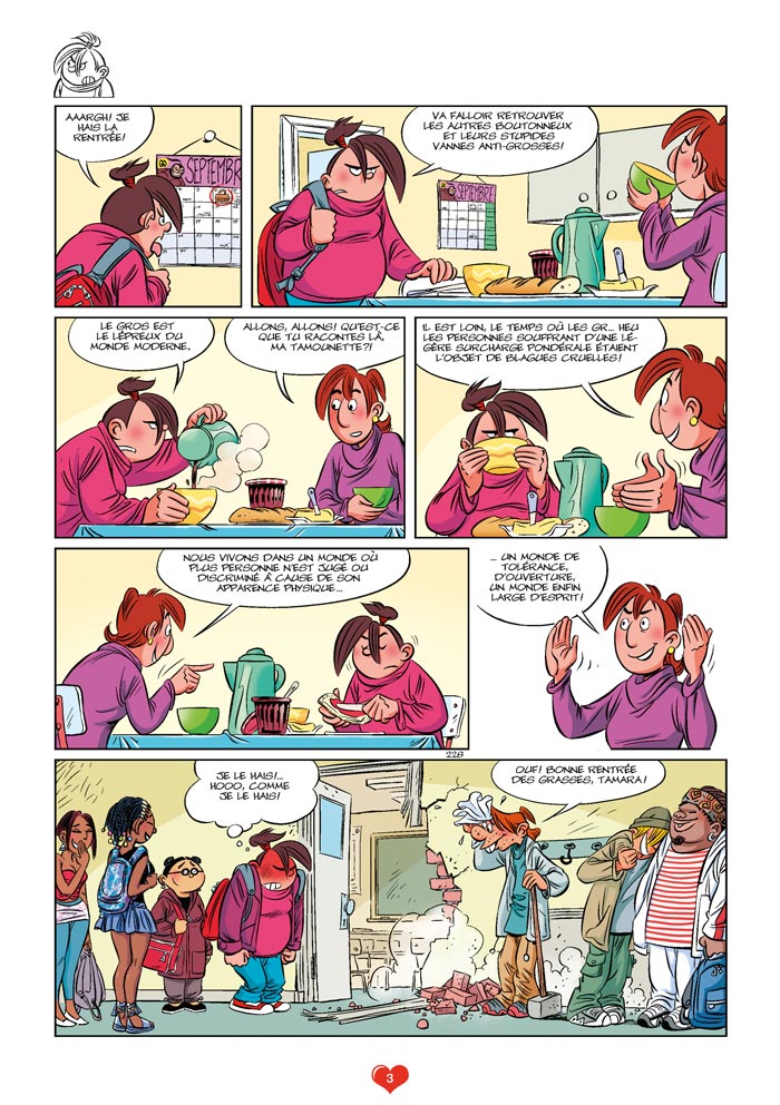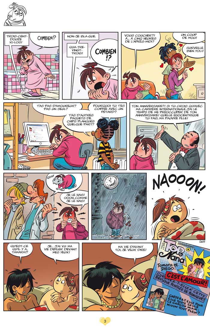 Pas facile d’être une adolescente de 15 ans rondelette avec un papa égoïste qui les a laissé, elle et sa maman. Et pourtant, il y a des contre parties : Maman a un super compagnon qui a une petite Yoli, avec qui Tamara s’entend tr ès bien… Et puis, à 15 ans, il y a les garçons !!!