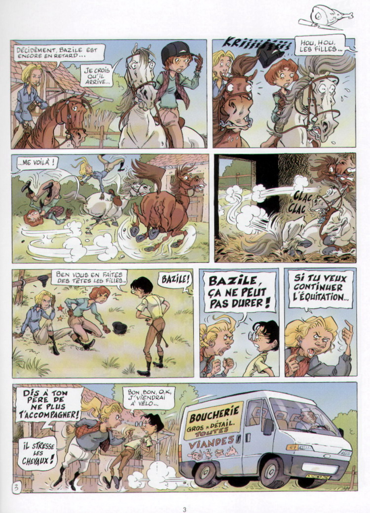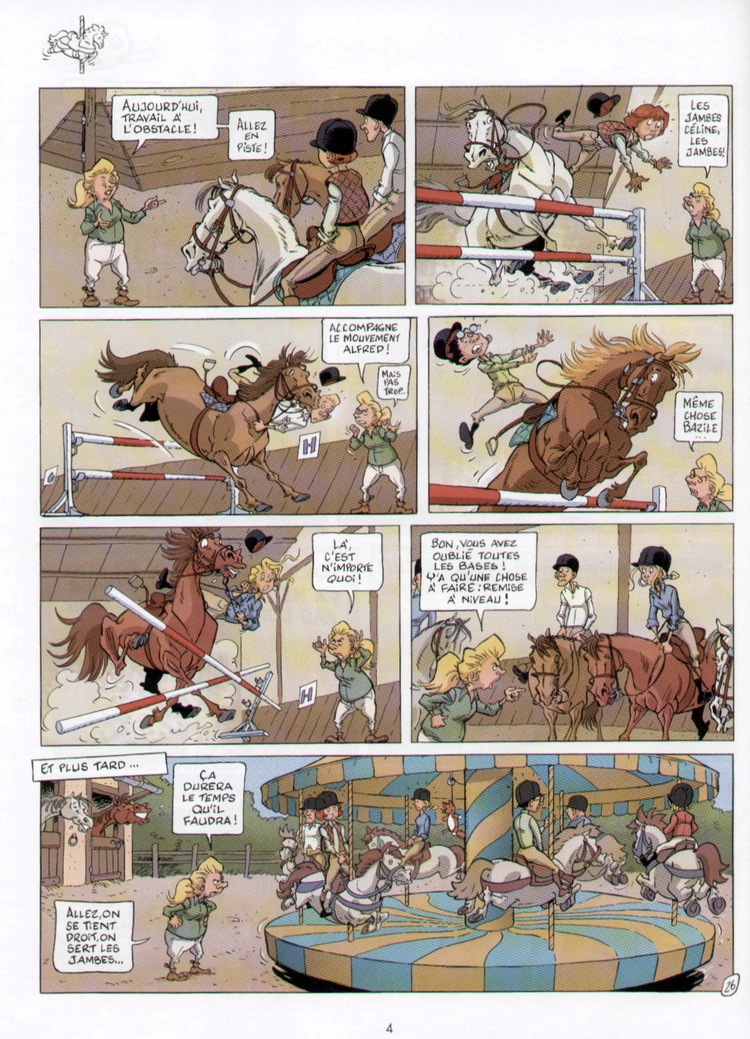 Séances de mise en forme, toilettage, promenades dans les bois... Eh oui, la plus belle conquête du cheval, c’est bien l’homme ! Ce ne sont pas les personnages hauts en couleur de cette BD qui le démentiront. Souvenez-vous, vous les avez sûrement déjà croisés... Il y a Monique, la monitrice du club hippique, pas très féminine, râleuse mais sympa ; son frimeur de fils Roméo, qui rêve d’être un grand champion de concours hippique ; Maud, amoureuse inconditionnelle des équidés, même quand il y a une litière à changer ; Céline qui, elle, préfère les cajoler que les monter ; et Bébert, l’emblématique palefrenier qui a toujours vécu "dans" les chevaux. Des chevaux fièrement représentés par Mascotte, le poney facétieux, Blanche Neige la jolie jument ou Ramsès le crack.