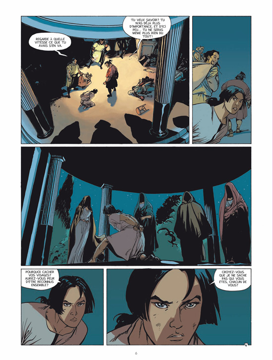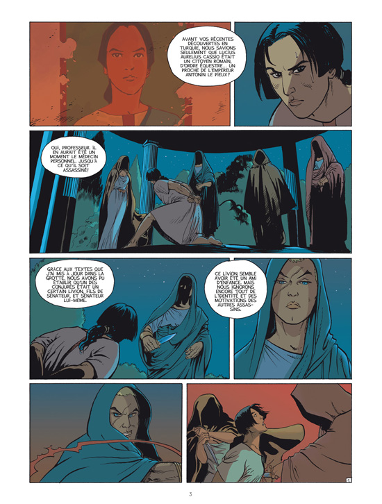 De prime abord, c'est le dessin qui m'a un peu rebuté, trop lisse, trop propre; puis l'intrigue: deux mondes se percutent d'une page à l'autre, le début de la fin de l'Empire Romain, vu par la société grecque, puis, sans crier gare, on se retrouve plongé dans notre siècle, au sein de fouilles archéologiques...Ainsi, on est en droit de se demander: "où les auteurs veulent-ils nous emmener???"