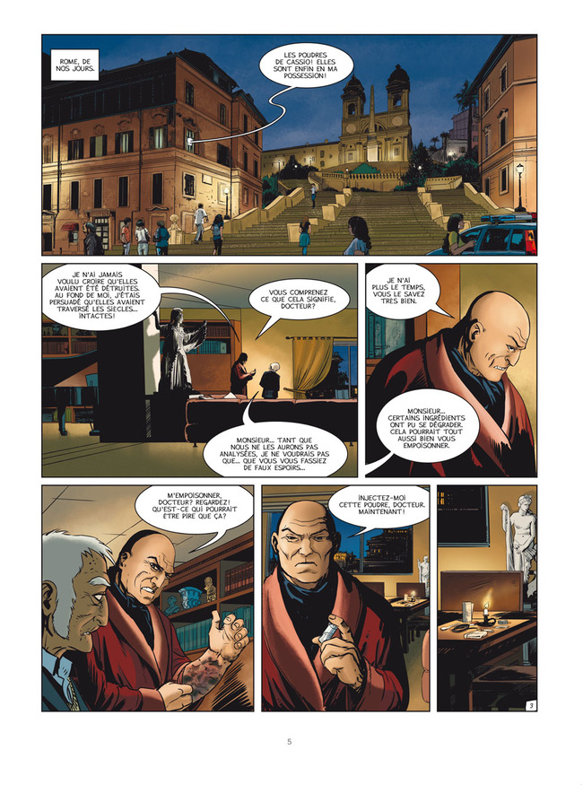 Les auteurs l'avaient annoncé, l'histoire de Cassio se déroulerait sous la forme de plusieurs cycles. Et voici qu'après le « cycle des assassins », constitué des 4 premiers tomes de la série, débute le « cycle de Rome » qui devrait comporter 2 albums. Stephen Desberg relance son intrigue sur deux époques, et si on commence à deviner les réponses de certaines questions, le « mystère Cassio » reste entier. Entre la destinée du héros dans la Rome antique et les découvertes de la belle archéologue Ornella Grazzi à notre époque dans une recherche qui s'avère à hauts risques, le scénariste nous balade habilement, sans aucun temps mort ni blabla inutile. Ici, l'histoire prime toujours sur l'Histoire. Et si Cassio détenait le secret de l'immortalité ? Gageons que l'implication du Vatican dans ce Chemin de Rome n'alourdisse pas la suite pour la faire pencher vers une aventure à la « Da Vinci Code », mais Desberg a suffisamment démontré son savoir-faire pour éviter ce genre d'écueil. Graphiquement, le dessin d'Henri Reculé frappe une fois de plus par son efficacité. Au fil des ans et des séries, le dessinateur a véritablement gagné une « patte » aisément reconnaissable, ici mise au service d'un découpage autant rythmé par les changements d'époque et de contexte que par les changements de plans. Mention spéciale aussi à ses séduisants personnages féminins...ainsi qu'aux toujours belles couleurs de Bertrand Denoulet. Cerise sur le gâteau : le tome 6, qui clôturera ce diptyque, est déjà annoncé pour la mi-juin. Une belle série, solide, peut-être encore trop discrète mais qui a tout pour devenir un « classique » et que ces nouveaux rebondissements pourraient vraiment faire décoller. Cassio -le personnage- devrait (enfin) apparaître clairement en couverture du prochain album, Cassio -la série- mérite elle aussi d'être mise en lumière !