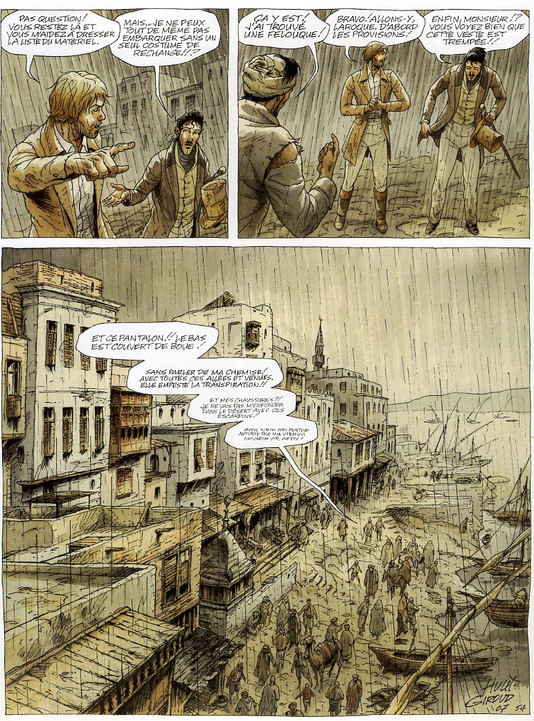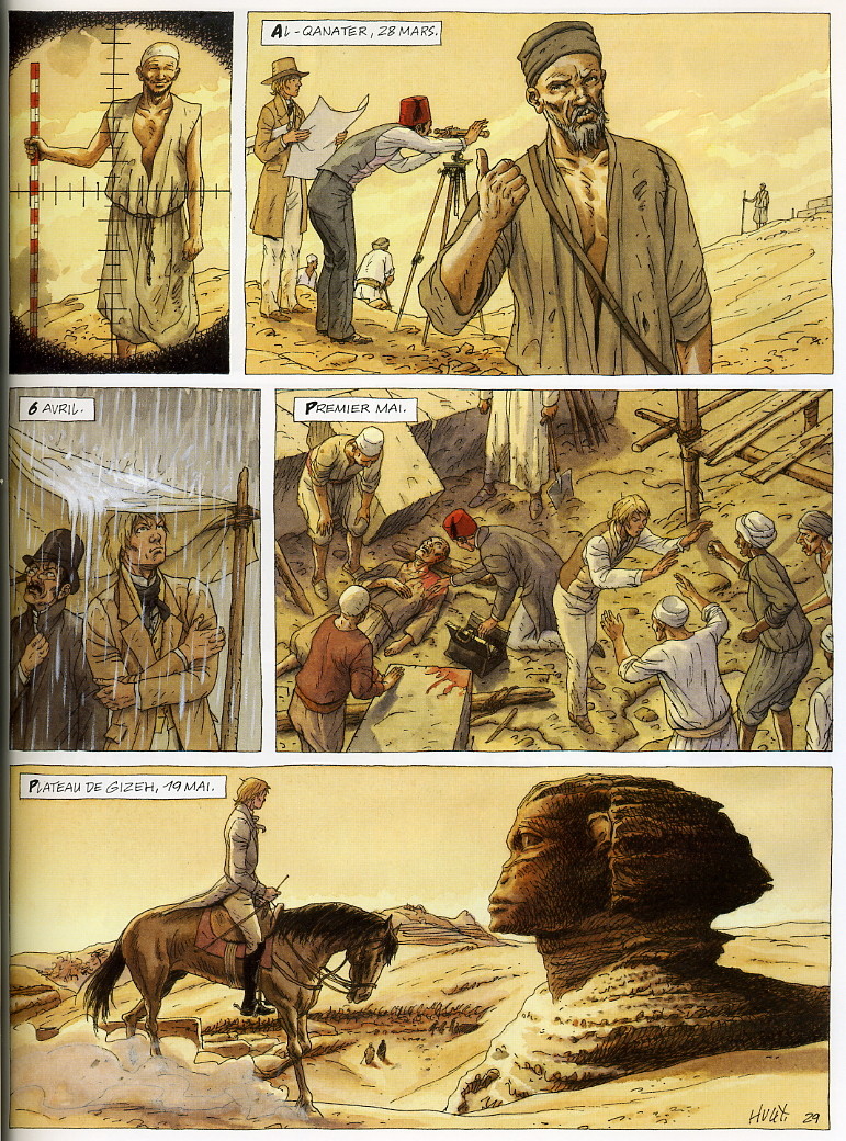 L'époque des grands travaux et des grandes découvertes du début du siècle passé est reconstituée avec brio par un Hublet dont la touche graphique a le chic pour magnifier chacun des paysage parcourus par les différents protagonites. Découvertes de tombes pharaoniques inconnues jusqu'alors, travaux titanesque tel la création du futur Canal de Suez, chaque représentation de lieu ou d'époque est splendide.