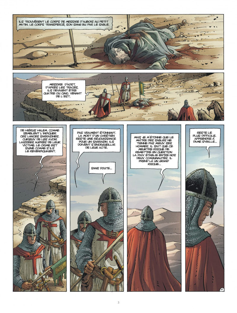 On retrouve messire d’Aubois mort, victime des sarrasins venus de Hierus Halem. Le meurtre les désigne. De son côté, le terrible Guy de Lusignan viole l’épouse d’Aubois, Sybille de Flandres et lui annonce qu’il va l’épouser. Il espère que cela relancera la guerre entre chrétiens et musulmans. Le sultan en veut à Zalkan qui s’est lancé sur les traces de d’Aubois. Il le fait décapiter et tue le mufti d’Alkar afin de récupérer le miroir de vérité. La guerre s’annonce. Renaud de Chatillon essaie de retenir les chevaliers de Lusignan. Il envoie Syria porter secours à Gauthier, parti sur les traces du Qua’dj dans la cité des flagellants.