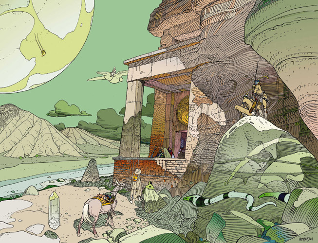 Influencé par les étendues désertiques du Mexique, il aime dessiner des personnages sur une surface plane et uniforme, qui peut aller du Sonora à l'absence totale de décor. Que ce soit dans les séries Blueberry ou Arzach, le désert est une figure récurrente dans son œuvre. En effet, parce qu'une aucune construction humaine ne vient imposer un sens déterminé, il autorise tous les possibles métamorphiques, d'où ses nombreux dessins où les personnages traversant le désert connaissent des métamorphoses surprenantes.