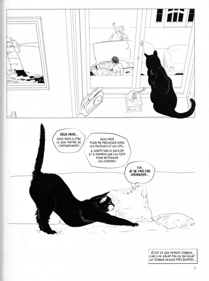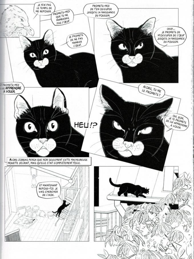 Cever met en exergue la substantifique moelle du roman de l’auteur chilien vendu à cinq millions d’exemplaires. Solidarité, tendresse, nature et poésie synthétisent les relations entre Zorbas et Afortunada. Alors que l’instinct du chat aurait été de croquer la mouette Kengah, puis sa progéniture, le félin se sent investit d’une mission improbable. Alors que les auteurs, que ce soit l’écrivain d’origine, ou bien son adaptateur, auraient pu facilement adopter un traitement fantastique, ils restent le plus cartésiens possibles. Le ton est scientifique, le trait est réaliste. Cever parvient à y instiller une émotion non dissimulée comme dans la scène où les chats enterrent Kengah.