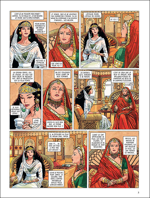 A M : Ce nouveau cycle commence lorsque Jade et le couple Nelson sont accueillis au palais du maharadjah d’Eschnapur. La maharani – la mère du maharadja – demande à Jade « d’instruire » la future épouse de son fils en l’initiant à l’art de l’amour. Pour cela, il y a un pavillon spécial, une espèce d’arène, dans lequel les deux femmes s’introduisent et ou il se passera beaucoup de choses… (Rires) D’un autre côté et c’est un peu « l’os » de l’histoire, le père de Tamila, la future épouse du maharadja, est un colonel recherché par les Anglais, qui sont aussi installé au palais ! Il y a là un rapport de force très intéressant entre les personnages.