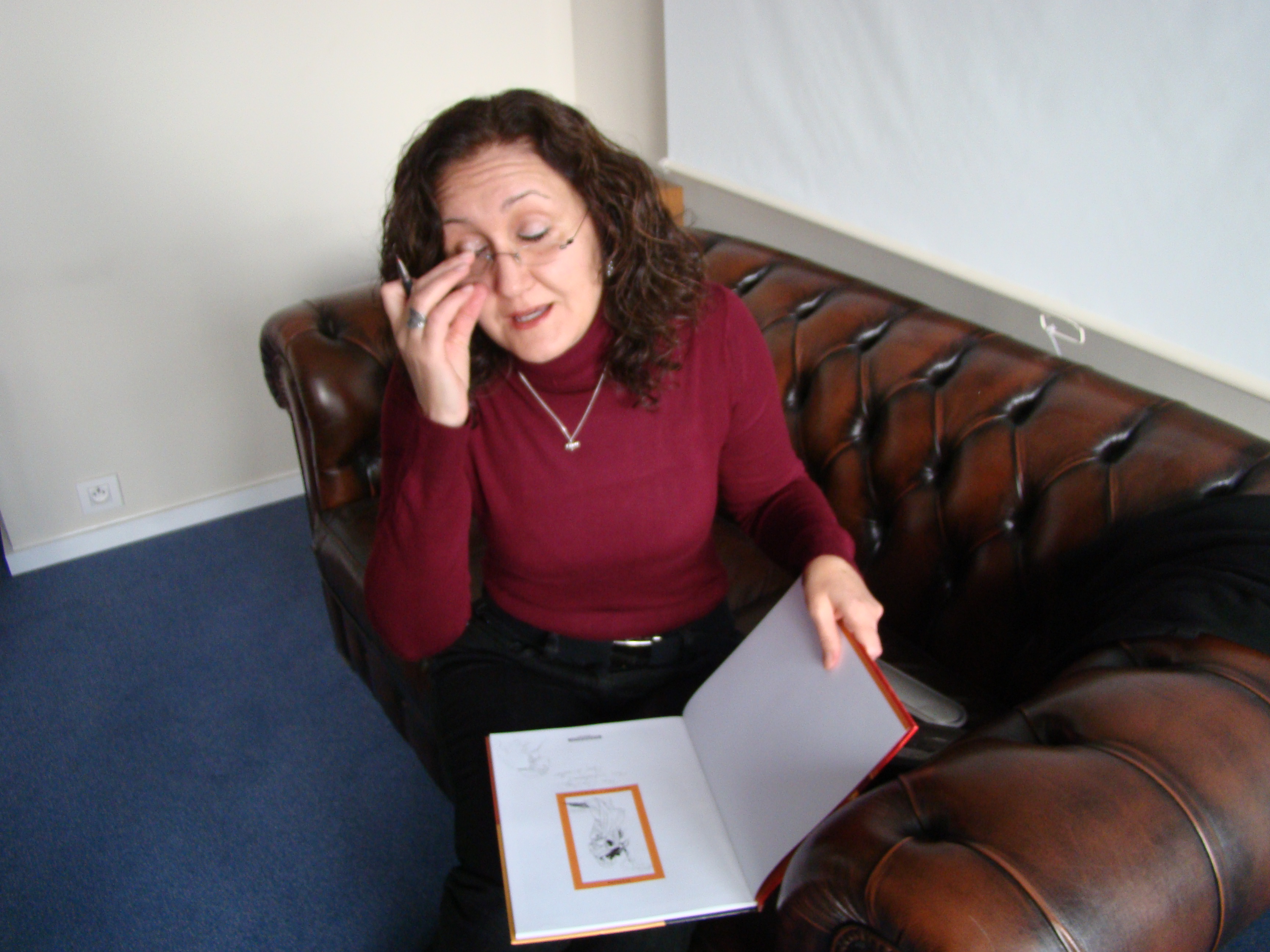 Ana ne fait pas l’encrage de ses albums. Elle ne fait que le crayonné des albums. Puis, je scanne ses planches et je les imprime et c’est sur ces impressions qu’Ana va appliquer les couleurs à l’aquarelle. C’est plus efficace car si elle se trompe dans les couleurs, elle peut recommencer directement sur une autre copie, sans devoir reprendre tout le dessin.