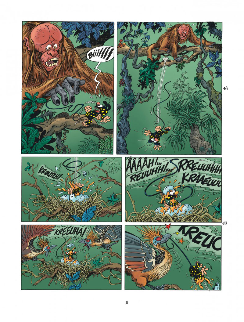 Oui, je l’aime bien. C’est l’ennemi juré des marsupilamis, le personnage bête et méchant par excellence, le pendant des Dalton dans les aventures de Lucky Luke. Chaque fois qu’on dessine des méchants, ils sont toujours un peu pitoyables. Les trois grosses crapules qui débarquent dans cette aventure, dont l’ignoble Mondrone qui kidnappe Biba pour essayer de la négocier, sont trois vrais méchants, mais pitoyables aussi. D’ ailleurs, ça se termine très mal pour l’un d’entre eux.