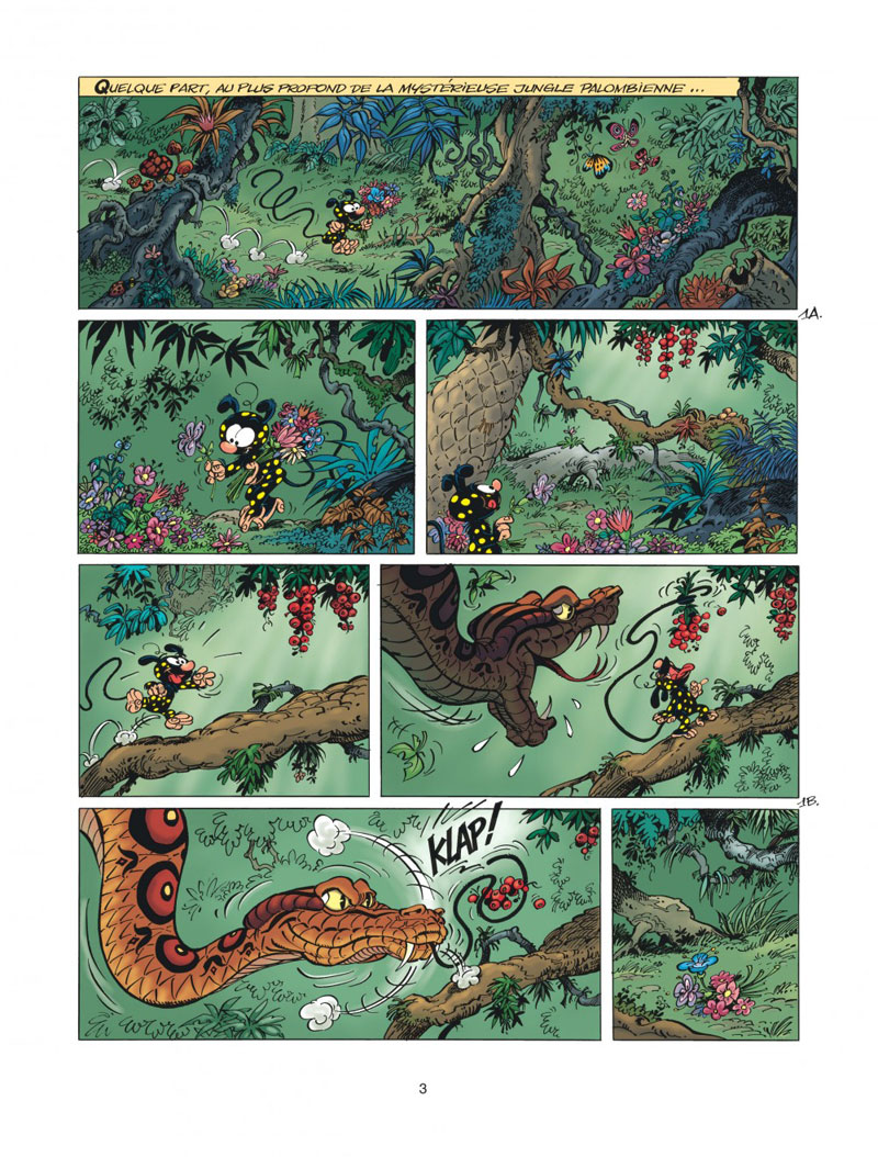 Je n’ai jamais travaillé dans l’ombre d’André Franquin, j’aime à dire que je travaille dans sa lumière. D’autant plus que ce n’est pas une reprise comme les autres. C’est un personnage que l’on m’a confié. Ce n’est pas une série. C’est un personnage qui n’existait pas comme héros à part entière. Tout l’univers dans lequel il évolue était à créer. Enfin, ce n’est pas tout à fait vrai puisqu’il y avait déjà eu Le nid des Marsupilamis, et André Franquin avait réalisé une bible graphique pour un projet de dessin animé. Dans les deux ou trois premiers albums, avec André, on s’est resservi de tout ça pour créer cette ambiance.