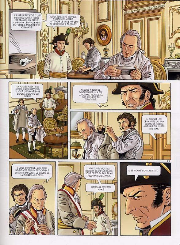 Plus qu’une idée, c’est un vif désir qui me hante depuis l’enfance... Tout comme celle d’écrire des scénarios, d’ailleurs. D’une santé fragile, je passais le plus clair de mon temps enfermé chez moi. J’attrapais tout ce qui passait et je souffrais d’asthme… Pour éviter les crises, mon pédiatre avait suggéré à ma mère de ne garder dans ma chambre qu’un simple lit couvert d’un plastique. Adieu jouets, oreiller en plume, rideaux, tapis, meubles et jolie petite déco ! Tout avait été retiré de la pièce. Paradoxe de la vie… Pour lutter contre mon manque d’oxygène, je devais vivre cloisonné dans ma bulle !... Dans cet espace à la fois vide et clos, il ne me restait plus qu’à projeter sur les murs blancs de ma chambre le fruit de mon imagination. Et pour m’évader, outre mes leçons qu’il me fallait rattraper, je m’immergeais dans les bandes dessinées, les illustrations de Brian Knight (de mes boîtes de p’tits soldats Napoléoniens, Airfix) et les séries TV. Je regardais ces dernières sur la vielle télévision noir et blanc de mes parents. Parmi les productions Françaises, j’étais passionné par les aventures du brave « Jean Roch Coignet » capitaine de La Garde Impériale, l’ancien bagnard « Vidocq » et… « Schulmeister, l’espion de l’Empereur » ! Je me suis assez tôt plongé dans sa biographie. Le souhait d’écrire sur cet ancien hussard n’a fait que croître avec les années, jusqu’au jour où l’occasion s’est présentée. Lorsque la maison d’édition Joker m’a proposer d’éditer cette nouvelle série, il m’a semblé capital de démarrer par la prise d’Ulm. Ce haut fait d’armes est peu ou mal connu. D’autre part, cette victoire est le prélude à la bataille d’Austerlitz, qui a entraîné la chute du Saint Empire Romain Germanique… Un an seulement, après le sacre de l’Empereur.