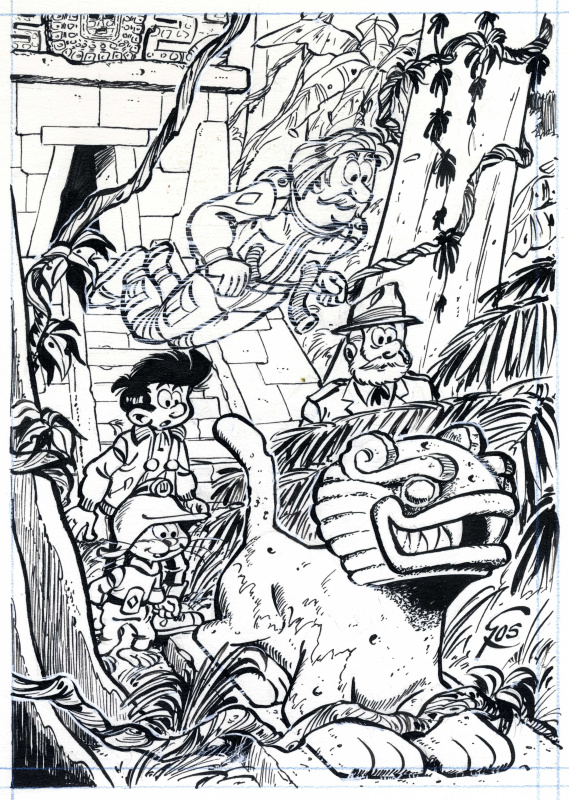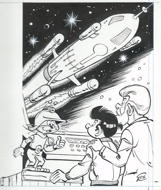 C’est fort possible. Quand j’ai commencé cette histoire, je suis allé voir Charles Dupuis et je lui ai dit que j’avais une nouvelle série à proposer. Il m’a dit : « Tâchez d’être original, parce que l’on a déjà un peu tout fait. ». Alors, j’ai dessiné trois pages et les dix suivantes au crayon. J’avais mon scénario écrit que je lui ai montré, et lui ai expliqué qu’avec mes personnages, je pouvais faire vivre des aventures dans le présent, dans le passé, dans le futur, ici sur terre ou sur une autre planète, rien n’était impossible. Il m’a répondu : « Je n’y aurais jamais pensé. Ça va faire un bel album ! ».