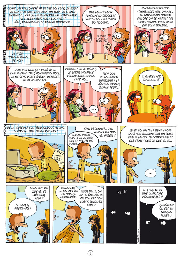 Oui, l'idée de la série est celle d'un couple qui dure malgré ses différences, donc les personnages devront évoluer en tant que couple, en passant par différentes étapes... La belle va croire qu'elle est enceinte, ce qui va remettre pas mal de choses en question. Le chômeur n'est vraiment pas prêt à cela, il n'a pas évolué dans sa recherche d'emploi et il a même arrêté de peindre, mais beaucoup d'amis et de connaissances vont intervenir dans ce tome 2, et le thème de l'amitié y sera très présent...