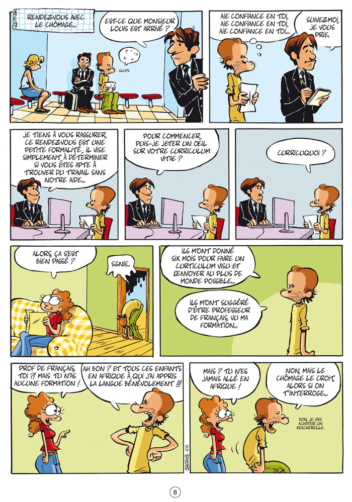 Je voulais éviter ces clichés négatifs, et je crois que justement la part autobiographique m'y aide. Je ne décris pas un chômeur qui profite du système, qui profite des autres... Mon personnage a un certain état d'esprit, peut vivre de peu, ça le caractérise très fort... Mais ce premier album expose surtout une situation de couple à une période de sa vie. Le chômage n'y est pas mis à l'avant-plan, et c'est quelque chose qui, pour moi, s'est construit naturellement quand j'ai commencé à travailler sur le projet. Mais mon chômeur devra aussi honorer des rendez-vous avec les services de placement, recevra des rappels et court toujours le risque de perdre le droit à ses allocations! On a beaucoup hésité sur le titre, mais actuellement je me rends compte que, justement, les gens ne s'attendent pas à ça et sont surpris positivement. Donc ce titre amène quelque chose de chouette !