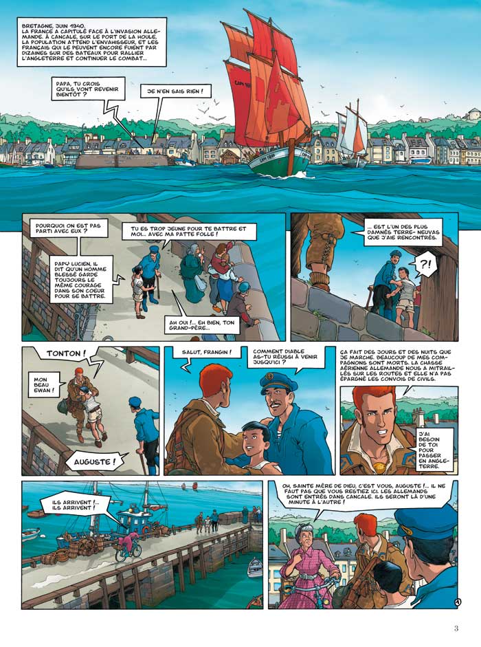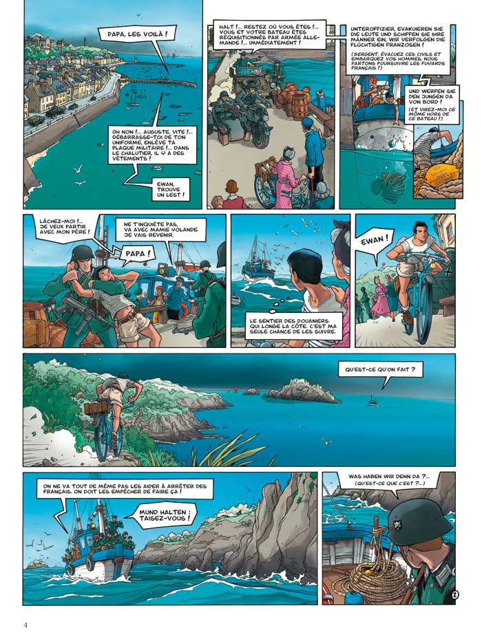 Saint-Malo est un personnage à part entière. Cela a été un vrai défi et un immense plaisir de donner vie à ce Saint-Malo ancien : ses vieilles rues étroites, avec ces maisons à pans de bois et aux fenêtres en vitrail. Son kiosque à musique, place Chateaubriand où les futurs internés du Fort National seront parqués le soir du 6 août. Le clocher de la cathédrale, d'une hauteur de 70 mètres, construit en 1859-1861 d'un style gothique magnifique qui sera détruit par un dragueur de mines. L'hôtel Chateaubriand devenu la Kommandantur de Saint-Malo, où Bastien interroge Corentin. Ses restaurants, la Duchesse Anne, le Café de la Bourse ou encore le Pomme d'Or et ses remparts... Sans oublier le quotidien des habitants, les longues files d'attente aux boulangeries ou aux magasins d'alimentation, les affiches de propagande, d'arrestation et d'exécution qui entretiennent la peur et la terreur. J'ai pris un réel plaisir à dessiner ces lieux et ces ambiances. Et je crois que cela se ressent, notamment sur le décors du fournil de Léon ou sur la cave de Lucien transformée en abri de fortune.