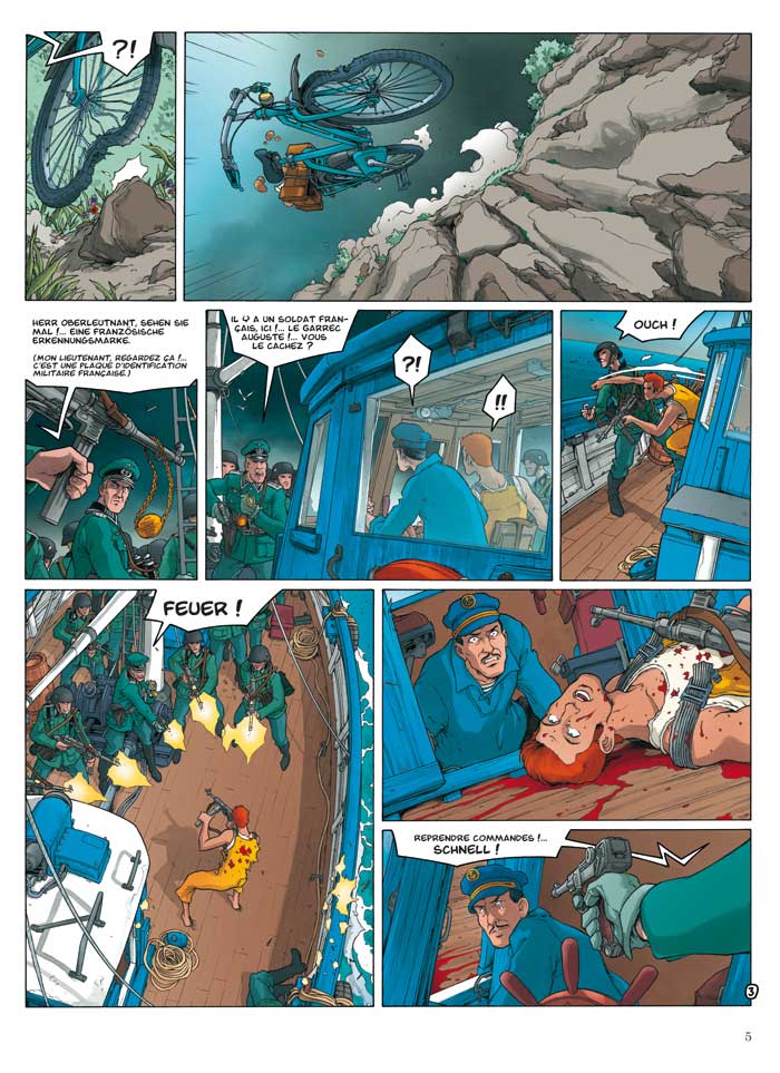 Si les Allemands restent les "méchants de service", j'ai voulu montrer que la progression et la force de frappe américaine a progressivement détruit le moral des troupes d'occupation, ré-enflammant les anciennes rancoeurs entre les corps de l'armée de terre et de la Kriegsmarine. La scène de mutinerie de la nuit du 5 août 1944, décrite dans la planche 32 est un fait réel. Ces soldats étaient à bout de force et si l'idéologie nazie tenait certains officiers à leur rigueur militaire et à leur obligation à obéir à tous les ordres, nombre d'entre eux souhaitaient ardemment la fin de la guerre. Chaos est effectivement le terme exact pour décrire ces jours qui ont précédé la bataille finale.