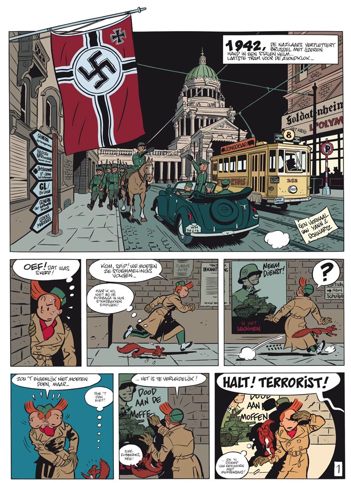 S: Je me suis mis en apnée profonde dans le troisième Reich. J'ai toute une collection des journaux de cette époque. J’ai parcouru notamment L'Illustration et le Miroir. J’ai étudié la vie des belges pendant l'occupation mais aussi celle des parisiens... Yann m'a apporté plus que sa part de documentation, n'hésitant pas à arracher les pages de livres afin que je reparte léger vers mon atelier en Loire-Atlantique !