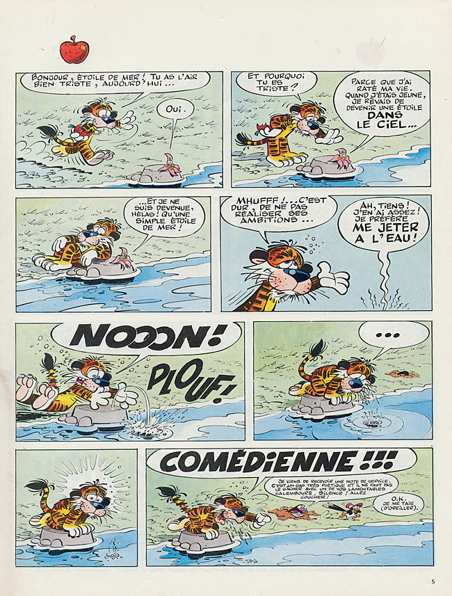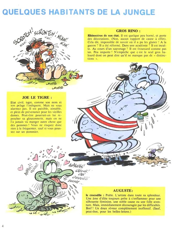 Joé est un tigre pacifiste. Pas dangereux pour un sou, sauf pour les pommes qu’il gloutonne, il prend un peu la position du lecteur, observateur des facéties de ses camarades.