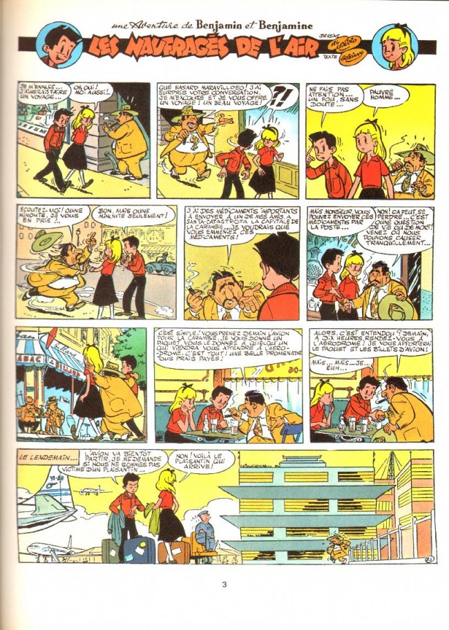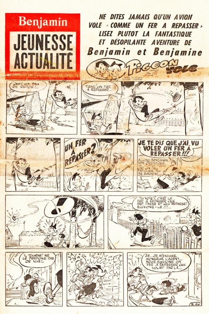 On m’a proposé de faire la première bande dessinée qui était publiée dans ce journal parce qu’il n’y en avait aucune. J’ai donc été le créateur de Benjamin et Benjamine à une époque où je dessinais comme un cochon de mon point de vue. Je me donnais beaucoup de mal pour les dessiner. J’étais très content de le faire. Je crois que j’ai illustré Benjamin et Benjamine plus d’un an, peut-être deux, de 1955 à 1956. Et à ce moment-là, en 56, j’ai été rappelé sous les drapeaux pour aller en Algérie. Quand je suis rentré, j’avais envie de reprendre contact avec le journal de Benjamin et Benjamine puisque j’étais moi-même l’auteur de la bande dessinée. J’ai ouvert le journal et j’ai vu qu’Uderzo faisait la bande dessinée à ma place. Bien entendu, je n’ai pas voulu aller réclamer ma place. C’était Uderzo qui l’avait prise, lui que j’admirais tant, qu’il la garde.