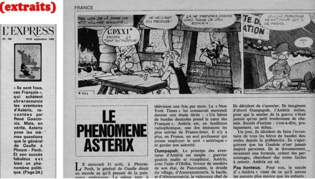Astérix a commencé à marcher suite à un article dans L’Express en 1966 à l’occasion de la sortie d’Astérix chez les bretons Cet article a été absolument déclencheur. Brusquement ce que représentaient Astérix et Obélix, c’est-à-dire la résistance d’une minorité contre une majorité qui les cernait de partout, ça coïncidait avec la politique de l’époque et la situation de la France. Ça a été une explosion, et brusquement, à la suite de cet article, tout le monde s’est reconnu dans les traits de deux Gaulois qui sont cernés de partout et qui résistent malgré tout en face de l’occupant. C’était un démarrage très tardif qu’ils n’attendaient plus du tout.