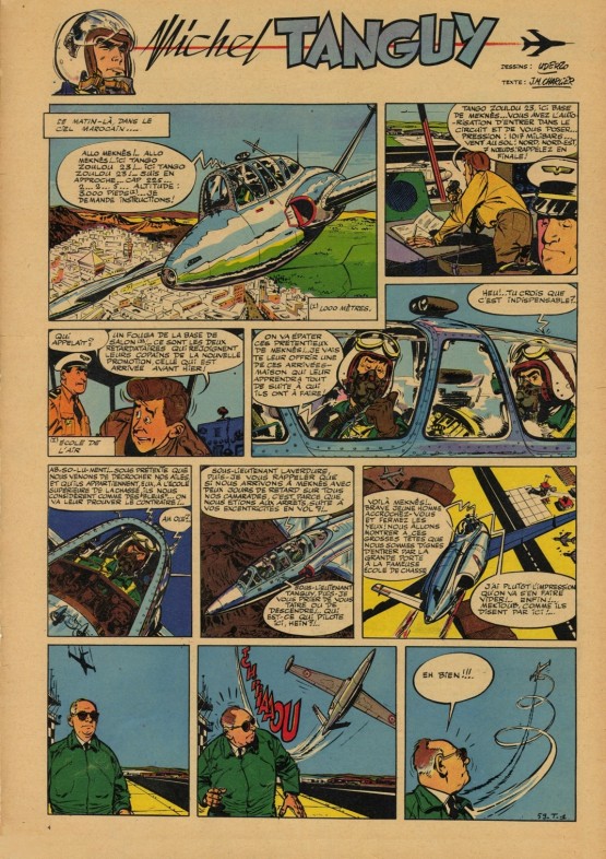 A la création du journal Pilote, lui, faisait Tanguy et Laverdure. Il réalisait deux pages réalistes par semaine qui concernaient l’aviation dans ce qu’elle a, à cette époque, de plus moderne. Il faisait en plus une troisième page humoristique qu’il devait dessiner à toute vitesse en deux ou trois heures sans doute, car je sais que en faisant Tanguy et Laverdure il ne pouvait pas faire autrement que de se déplacer en allant sur place pour prendre des photos. Les avions à réaction ne se dessinaient pas comme ça. C’était un travail énorme de faire deux pages hebdomadaire plus Astérix. Et moi j’en étais encore à me poser la question : “Comment vais-je m’y prendre pour apprendre ce métier ?”.