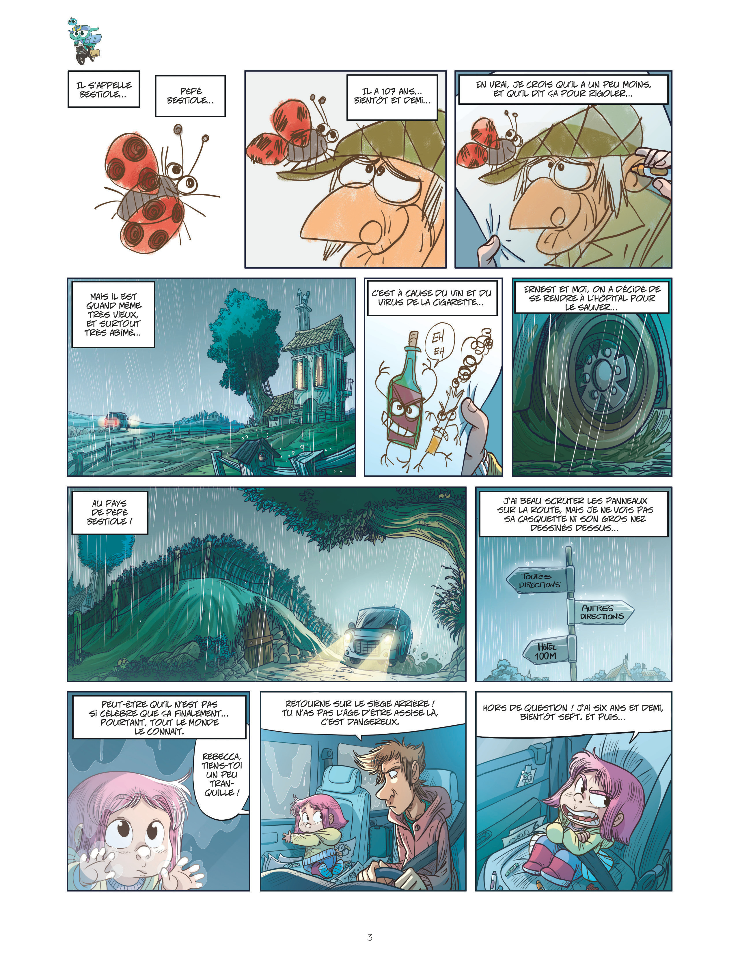 « Il s’appelle Bestiole… Pépé Bestiole… Il a 107 ans… Bientôt et demi… En vrai, je crois qu’il a un peu moins, et qu’il dit ça pour rigoler… Mais il est quand même très vieux, et surtout très abîmé…(…) Ernest et moi, on a décidé de se rendre à l’hôpital pour le sauver… »