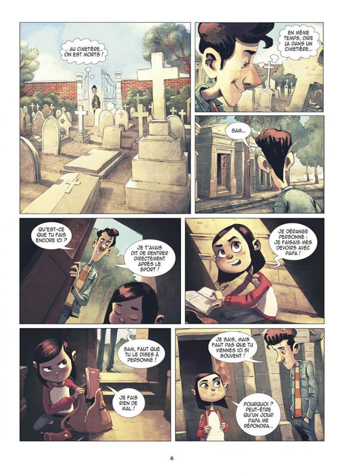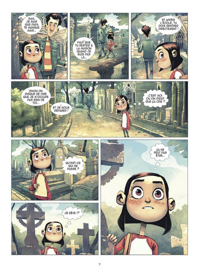Après des albums plutôt ados/adultes, Julien Monier débarque dans la bande dessinée jeunesse dans un graphisme cousin de celui de Renaud Collin dans le Monde selon François publié chez le même éditeur à la fin des années 2000. Les grands yeux de Sam font chavirer. Les inquiétudes de Tim se partagent sur son visage. Les angoisses et les joies de Louise transparaissent de ses expressions. Les fantômes survolent les situations dans des représentations éthérées et dont les couleurs bleuâtres aident à la condition. Tel un esprit passant à travers les murs, Monier n’hésite pas sortir du cadre de la planche classique lorsque c’est nécessaire comme dans la scène où les héros passent de pièce en pièce dans leur maison et qu’on les voit à chaque fenêtre.