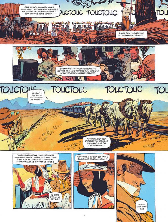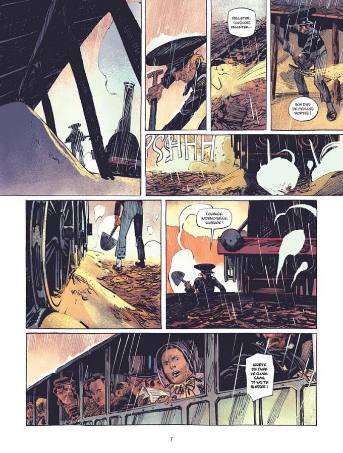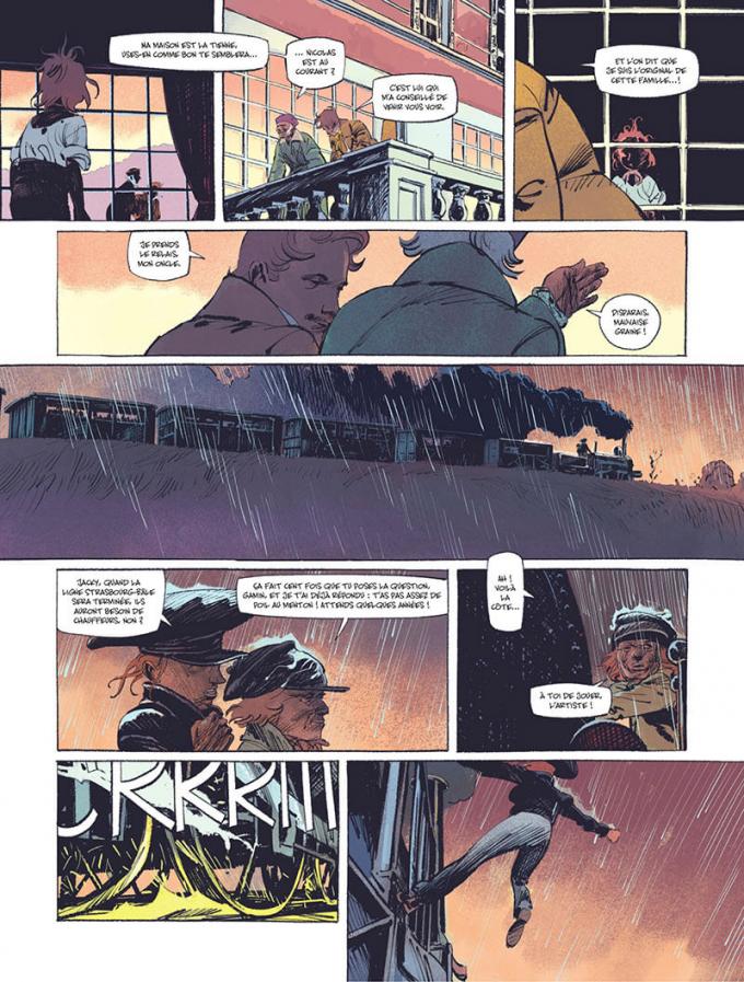 Le scénariste Stéphane Piatzszek s’est emparé d’une famille, d’un événement et d’une époque pour raconter une saga réaliste et romanesque. A quoi bon inventer des histoires quand la réalité offre une aventure plus forte que toute fiction, surtout a une époque où tout cela semblait n’être que folie ? Piatzszek l’a bien compris. C’est même à se demander si Jean Van Hamme ne s’est pas inspiré de la famille Koechlin pour écrire Les maîtres de l’orge. Avec les frères Doomi et Fink, Piatzszek ajoute la part fictionnelle apportant de l’humanité. Avec leurs destins aussi différents que déterminés, ils introduisent toute l’émotion nécessaire à en faire une histoire forte. On rêve de conduire un train avec Doomi. On vibre sous les coups de pinceaux ravis de Fink.