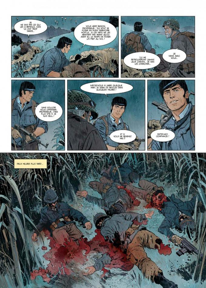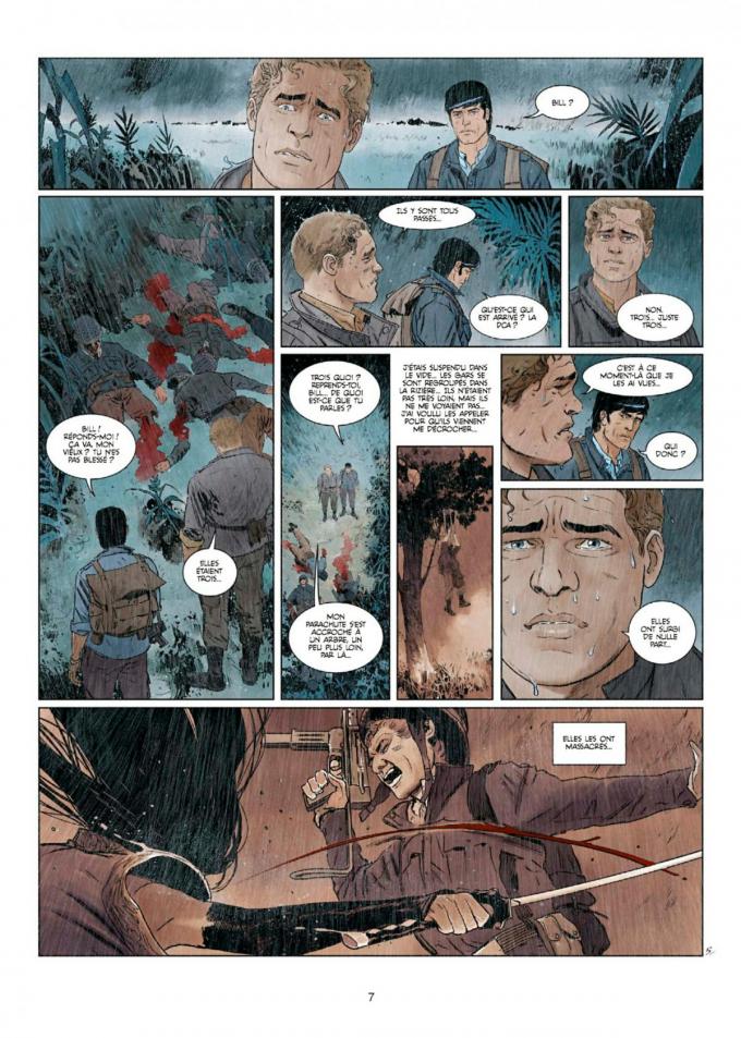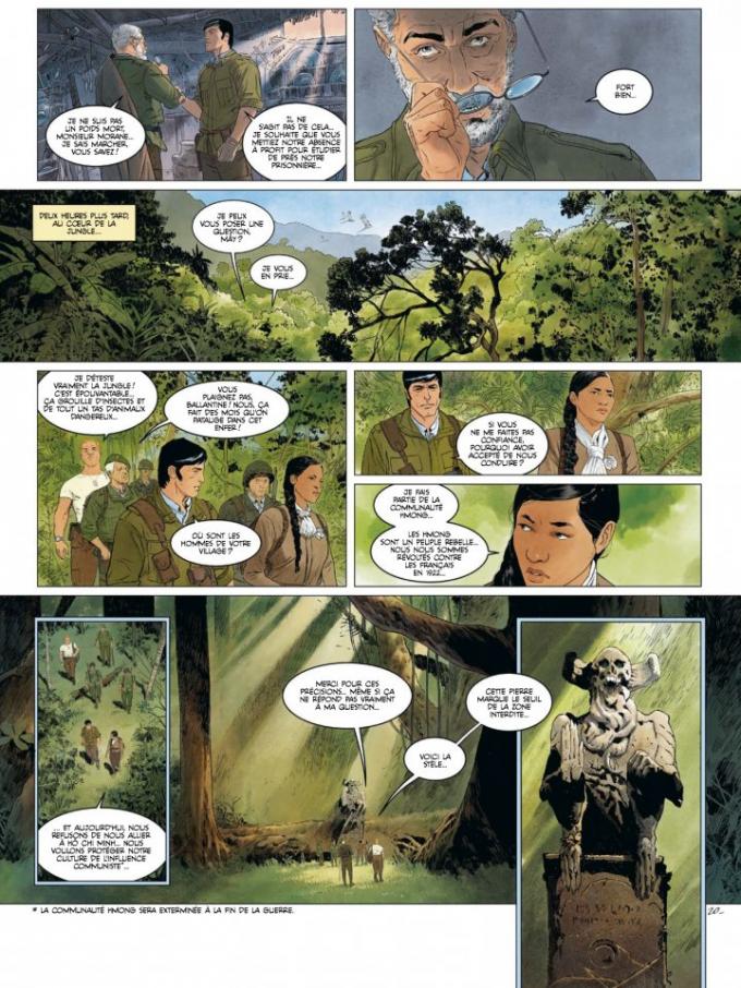 Christophe Bec et Corbeyran écrivent une histoire permettant de rallier tous les fans de la série et les nouveaux venus amateurs de BD d’action. Henri Vernes, avant de nous quitter, leur a apporté sa bénédiction en préface. Il peut reposer en paix. On dirait une histoire qu’il aurait écrit lui-même. Aux côtés de Morane, on retrouve son comparse de toujours, l’irlandais Bill Ballantine, qui apporte la dose d’humour irlandais qui lui est caractéristique. Est également au générique l’ennemi de toujours : L’Ombre Jaune, toujours aussi énigmatique et cruel. Les auteurs apportent quand même un petit peu de leur ADN. Le scénariste de Carthago et celui du Chant des Stryges unissent leurs forces. Ils prouvent, et peut-être même découvrent, qu’ils sont des enfants d’Henri vernes. Dans la jungle au Sud d’Annam, ils font se côtoyer des personnages fondateurs de la BD et du roman populaire du XXème siècle avec de nouveaux venus comme le professeur Borulnik, ponte en anthropologie et en neurologie, avatar de Boris Cyrulnik, qui a établi le concept de la résilience, capacité d’adaptation d’une personne suite à un traumatisme. Et des traumatismes, ce n’est pas ça qui va manquer dans « Les 100 démons de l’Ombre jaune ».