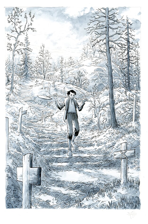 A l’occasion du 3e tome de la série « Stern », Julien Maffre, habitué du travail en digital, réalise pour la première fois des originaux de manière traditionnelle. L’occasion de découvrir trois magnifiques couvertures et des illustrations réalisées à l’encre et au lavis bleu. Son trait enthousiaste, friand de détail et d’une grande expressivité confie à ce croque-mort allergique aux armes à feu un touchant supplément d’âme.