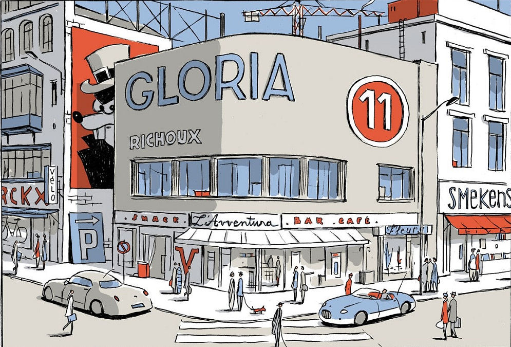 L’Avventura est l’illustration qui symbolise à merveille le contenu de l’exposition Avril à Bruxelles. Elle fera l’objet d’une sérigraphie artistique éditée par Champaka Brussels François Avril : « Dans l’image L’Avventura, on voit un magasin de vélos Eddy Merckx. J’adore le vélo et j’ai longtemps eu un vélo de cette marque. Pour moi, l’histoire du vélo est belge. Sur le côté droit, il y a un magasin Smekens. C’est le nom de jeune fille de la femme d’Ever Meulen. Ce clin d’œil à un ami dessinateur me permet d’utiliser un nom qui, pour moi, sonne typiquement belge. Le bâtiment du centre est connu des personnes qui quittent la Gare du Midi pour s’engager sur les boulevards du centre. Le chiffre « 28 » qui est inscrit sur le vrai bâtiment m’inspire peu ; je le remplace donc par un « 11 », mon chiffre porte-bonheur. J’avais besoin d’un nom très court pour remplacer le mot Perle qui se trouve sur la façade arrondie. Ce sera Gloria, le prénom de ma cadette. Ce terme positif peut également représenter autre chose. Le vrai nom du salon de thé – L’Avenida - laisse la place à L’Avventura, un flm d’Antonioni. J’ai toujours trouvé cela formidable les deux « v » de ce mot italien ! La voiture est une réminiscence de la Turbotraction. Pour le mur BD peint - une spécialité bruxelloise - j’ai opté pour un portrait d’Anthracite. La mort de Raymond Macherot, fn de l’année dernière, m’a beaucoup touché. J’espère qu’il aura un jour son mur peint...»