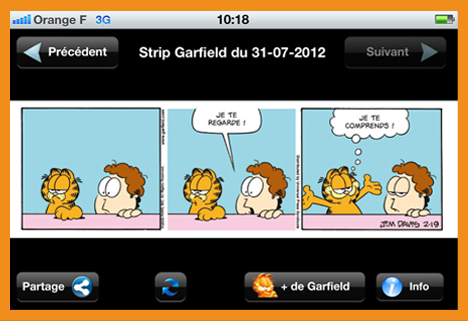 Pour 0,89€, l'appli Garfield-BD du jour vous donne droit à un nouveau gag. Vous pourrez aussi revoir les neuf derniers strips que vous avez consultés sur votre téléphone portable. Et même si Garfield déteste partager sa pizza, rien ne vous empêche de partager avec vos amis vos gags favoris par mail, sur Facebook ou sur Twitter. Et puis, Garfield n'est pas aussi égoïste qu'on le dit, surtout à l'approche de Noël…