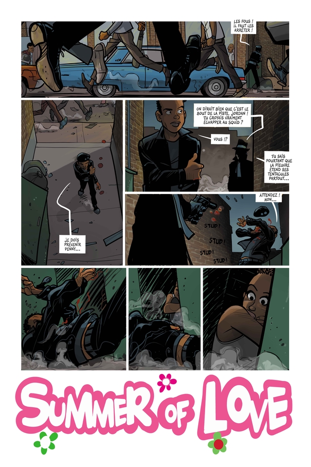 Le québécois Michel Viau est à la base historien de la BD. Il écrit ici deux histoires parallèles qui se rejoignent dans un final jamesbondien. Les pages de garde montrent d'emblée le ton. Hommage à toute une culture seventies, Summer of love multiplie les clins d’œil sans pour autant tomber dans le piège du catalogue. Squiddly la pieuvre intègre un délire psychédélique, Scoubidou et Sammy font un caméo dans la rue pendant que tout un tas d’acteurs célèbres jouent les seconds rôles grâce aux talents de caricaturiste de Ghyslain Duguay. Le dessinateur a un trait à mi-chemin entre Bruno Gazzotti et les débuts de Mathieu Reynès. Côté couleurs, le dessinateur gère impeccablement l’époque. C’est pop mais pas criard.