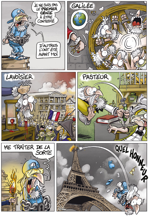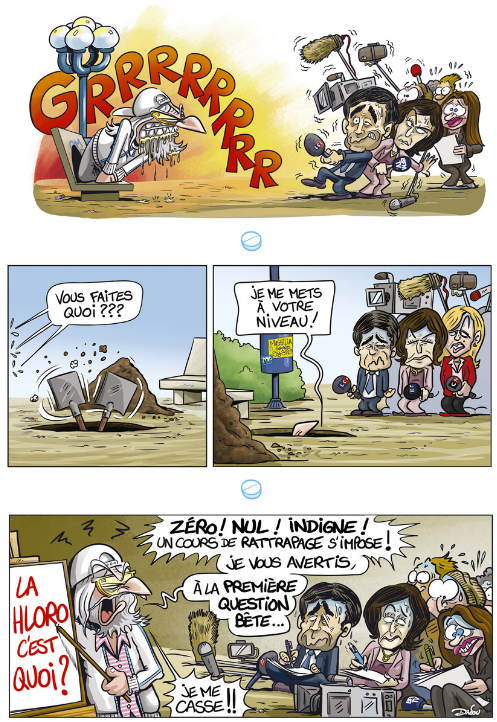 Dadou est parti d’un dessin humoristique qu’il a réalisé pour les réseaux sociaux sur lequel Raoult, en dealer de banlieue marseillaise, demande à un Macron flippé s’il recherche de la chloroquine. Il n’en fallait pas plus pour déceler en ce personnage la puissance d’un héros comique de bande dessinée. En fin de confinement, l’album est écrit. Il est dessiné dans la foulée. En sept mois, un dessin d’actu a donné naissance à une BD décalée, marrante, dans l’air pas très pur du temps, bref, un album historique en quelque sorte, témoignage d’une année chahutée. Dadou a récemment rencontré Raoult. Le médecin l’a remercié pour cette merveilleuse idée.