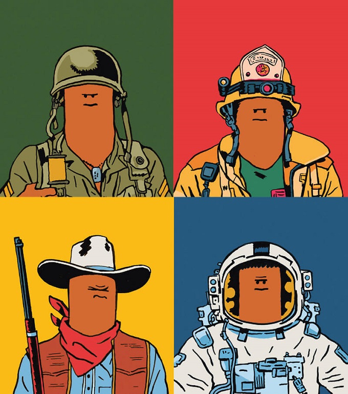 Les gags en quatre cases forment un récit qui se déroule et met en boîte non seulement l’industrie cinématographique, mais aussi l’Amérique des soixante dernières années, de la guerre du Vietnam à la moumoute de Donald Trump.