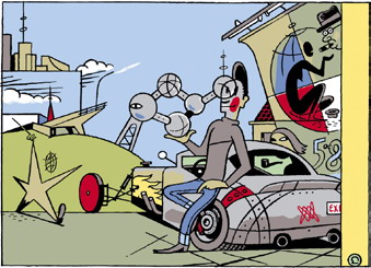 Ever Meulen parle avec émotion des sensations qui furent les siennes en découvrant l’Atomium. « C’était un été très ensoleillé, et je n’ai gardé de ces visites que des souvenirs positifs sur l’Expo ‘58. L’Atomium en était l’élément le plus spectaculaire. » En 1967, il quitte son village de Flandre occidentale pour venir étudier le graphisme à Bruxelles. « J’ai alors assez vite pris le tramway pour revoir l’Atomium. J’ai toujours bien aimé le plateau du Heysel, un site que j’avais fréquenté, gosse, lors de visites au Salon de l’automobile. » Enfant, le jeune Eddy rêve de faire le même métier que celui de ces auteurs dont il dévore le travail dans « Tintin » et « Spirou ». « Ces deux journaux étaient tellement importants pour la jeunesse, à cette époque. Cela m’a vraiment procuré beaucoup de joie et de bonheur. Je vivais dans un village isolé de Flandre occidentale et la bande dessinée, pour moi, c’était Bruxelles, et c’était francophone. En arrivant à la gare du Midi, j’étais confronté à la tête géante de Tintin, et en me baladant dans les rues de Bruxelles, j’étais constamment confronté à des images qui ressemblaient à du Franquin. » Avec la sérigraphie « Automium », Ever Meulen rend hommage aux passions héritées de sa jeunesse : automobiles, Expo’58, un trait « ligne claire » et une gamme de couleurs très « années ’50 ». « Après une période où je n’ai plus dessiné de voitures car tout le monde m’en demandait, je suis revenu à ce qui est toujours resté une passion pour moi. En combinant des formes pas évidentes à marier, je fais du « customising » automobile en dessinant. Je voulais faire de la bande dessinée parce que j’aimais bien dessiner les voitures, les architectures, les gens dans la rue… La bande dessinée était le moyen de faire tout cela. Je ne réalise pas de BD classique, mais je fais mes histoires dans mes dessins. » Le Maître Illustrateur voit l’Atomium comme une statue. « C’était très original, de faire cela à l’époque. Je l’ai montré à beaucoup de visiteurs américains ou autres, et tout le monde est impressionné. Même moi, je continue à l’être. J’y suis retourné début de cette année, c’était un jour très lumineux, avec un ciel ultra-bleu. C’était formidable d’être là, et je crois que cette sérigraphie bénéficie de ce que j’ai ressenti à ce moment-là. Je suis content que l’Atomium existe, que ce soit dans notre jardin, ici à Bruxelles. »