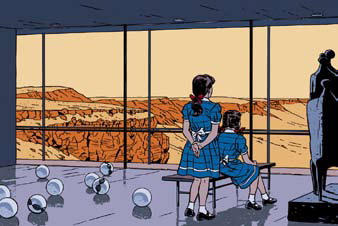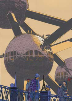 Le créateur de « Ray Banana » découvre l’Atomium, en photo, dès 1958, et le visite enfin en 1982. " C’est une des premières choses que j’ai vues lors de mon premier voyage à Bruxelles. J’ai même acheté deux ou trois souvenirs d’époque, dont un truc à ressort, un petit hélicoptère qui tournait autour d’un Atomium ; l’ensemble se rangeait dans une boîte ronde recouverte de tissu écossais.» Découvrir le monument en vrai modifie la perception. « En effet, cela a été capital de descendre à pied par les tuyaux car, dedans, ça ressemblait plus à Jules Verne qu’à Spoutnik.» Pour le dessinateur de deux « Blake et Mortimer » de superbe facture, l’Atomium n’est pas indéfectiblement rattaché à l’Expo ’58. « Oui bien sûr, et non parce qu’il a survécu, et pas l’expo. Ce qui lui donne une signification tout à fait différente. L’expo n’était que dans le présent, lui est maintenant aussi dans le passé. Un peu comme le morceau de la Statue de la Liberté émergeant des sables, que découvre Charlton Heston à la fin de “La Planète des Singes” » Une scène qui a été un des multiples déclencheurs (avec, entre autres, une photo « anodine » de deux jeunes visiteuses, l’architecture d’un pavillon, et la statuaire présents à l’Expo ’58) de la sérigraphie 21st Century Atomic Girls. Pour l’auteur de Vers la ligne claire, il est assez facile de rendre hommage à l’Atomium « car les rêves et les illusions qu’il symbolisait ont quelque chose de touchant. De plus, étant un objet plein de vide, il fait appel à une notion de l’espace, ce qui est une des choses les plus intéressantes à dessiner. » On dit toujours qu’une bonne image doit être séduisante, mais aussi raconter une histoire ou dégager une « petite musique ». « Ce n’est pas à moi d’expliquer cela, précise Ted Benoît. Une piste: le titre est une paraphrase d’une vieille chanson de “King Crimson” 21st Century schizoid man. Je ne l’aime pas tant que ça, mais j’ai été très frappé de la reprise d’une autre, du même album, dans le film Les fils de l’homme d’Alfonso Cuaron. Ce que raconte ce film (un des plus passionnants films récents) me semble très juste pour la compréhension des années à venir. L’Atomium est le XXe siècle, nous sommes au XXIe, il nous a aidés à comprendre les temps nouveaux, c’est tout. Pourquoi des petites filles ? Aucune idée. C’est la petite musique. »