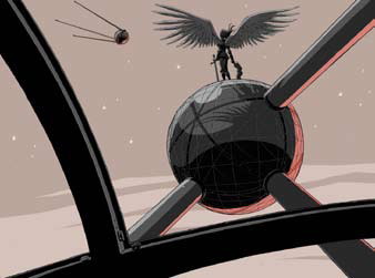 Pour Yslaire, l’auteur de « Sambre », l’Atomium est le rêve des années ’50. « La science va sauver le monde par le progrès. D’ailleurs, les neuf boules préconisent déjà la conquête spatiale. Par leur forme, elles évoquent autant les planètes du système solaire, que le “Spoutnik” parti dans la stratosphère un an auparavant. De l’atome à l’univers, l’infiniment petit rejoint l’infiniment grand. C’est magique. » Ce passionné de l’oeuvre de E-P Jacobs déclare, en souriant, que « un jour, l’Atomium va partir dans l’espace comme une fusée. Personne ne vous l’a dit, mais c’est un vaisseau spatial de “Blake et Mortimer” déguisé en monument. » Yslaire est né en 1957, au moment où l’Atomium était en construction. Il n’y voit pas un hasard. « J’ai l’impression que ce monument m’appartient, qu’il est né en même temps que moi. Que c’est chez moi. Peut-être même que je sors de son ventre d’acier… Fragile, ça ne peut pas tenir debout, huit boules qui reposent sur une seule!), majestueux (on se sent tout petit, quand on passe en dessous) et moderne (rien que ce mot fait déjà vieux). » Yslaire a choisi de réunir dans cette image les symboles forts de Bruxelles : l’Atomium, Saint Michel et Manneken Pis. « J’ai tout de suite vu le rapport de matière entre l’acier du monument et le métal de l’armure. » Il n’est pas étonnant de découvrir que l’auteur de « XXeciel.com » est autant passionné par la conquête de l’espace que le ciel. « J’aime bien cette idée d’associer un ange avec un gamin nu. Bruxelles est un savant mélange d’aspiration ambitieuse et de vulgarité réconfortante. En tout Bruxellois qui sommeille, il y a un ange combattant ses démons et un petit garçon joufflu qui pisse en souriant. Le spirituel et le prosaïque … » En associant le Spoutnik et les étoiles - clin d’oeil à celle qui fut dessinée par Lucien De Roeck pour le logo de l’Expo ’58, c’est un peu l’avenir qui se profile. « Et Saint Michel, patron de Bruxelles, complète l’artiste, évoque le passé moyenâgeux de ma ville natale. La conjugaison des deux donne, j’espère, un “instant d’année”, un petit moment d’éternité… »