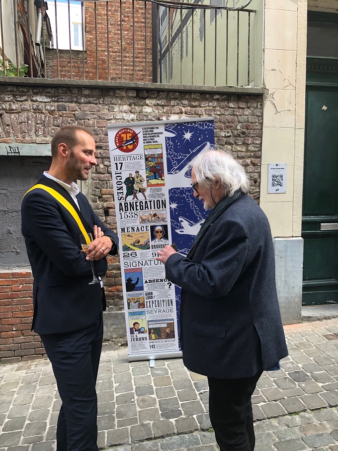 Ce vendredi 24 septembre, c'est en compagnie de Madame Marie Parisot, Directrice commerciale et marketing chez Dargaud, que l'Echevin de la Rénovation urbaine, Arnaud Pinxteren l'a inaugurée, soit 2 jours avant la date anniversaire des 75 ans de la parution de la première planche du "Secret de l'Espadon" dans le Journal Tintin.