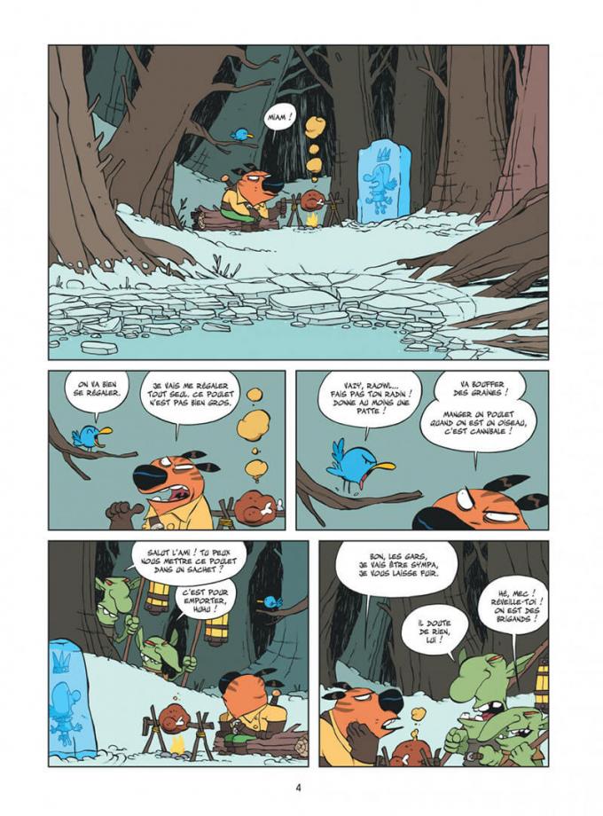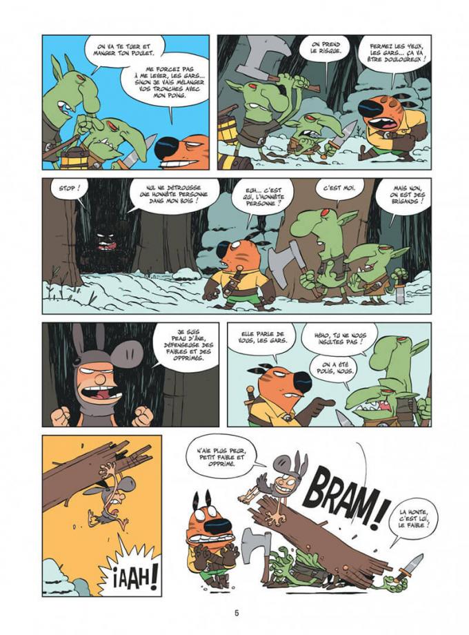 Alors qu’il s’apprêtait à dézinguer deux trolls venus le détrousser de son repas, Raowl voit débarquer d’entre la forêt profonde une petite princesse, haute comme trois pommes, vêtue d’une peau d’âne, et bien décidée à faire régner la justice sur son territoire. Inutile de préciser que les deux barbares vont pouvoir numéroter leurs abattis. Peau d’âne, puisque c’est ainsi qu’elle se nomme, propose alors à Raowl d’aller sauver une nouvelle princesse en détresse retenue par un troll des cavernes. Mais ce que notre héros ignore encore, c’est que la tête de sa nouvelle camarade a été mise à prix par le roi, son père. Des chasseurs de prime sont sur ses traces… Le souverain a une nouvelle fiancée, Briguite, qui ne veut plus de gens sales dans le Royaume. « Donc, on les élimine... »